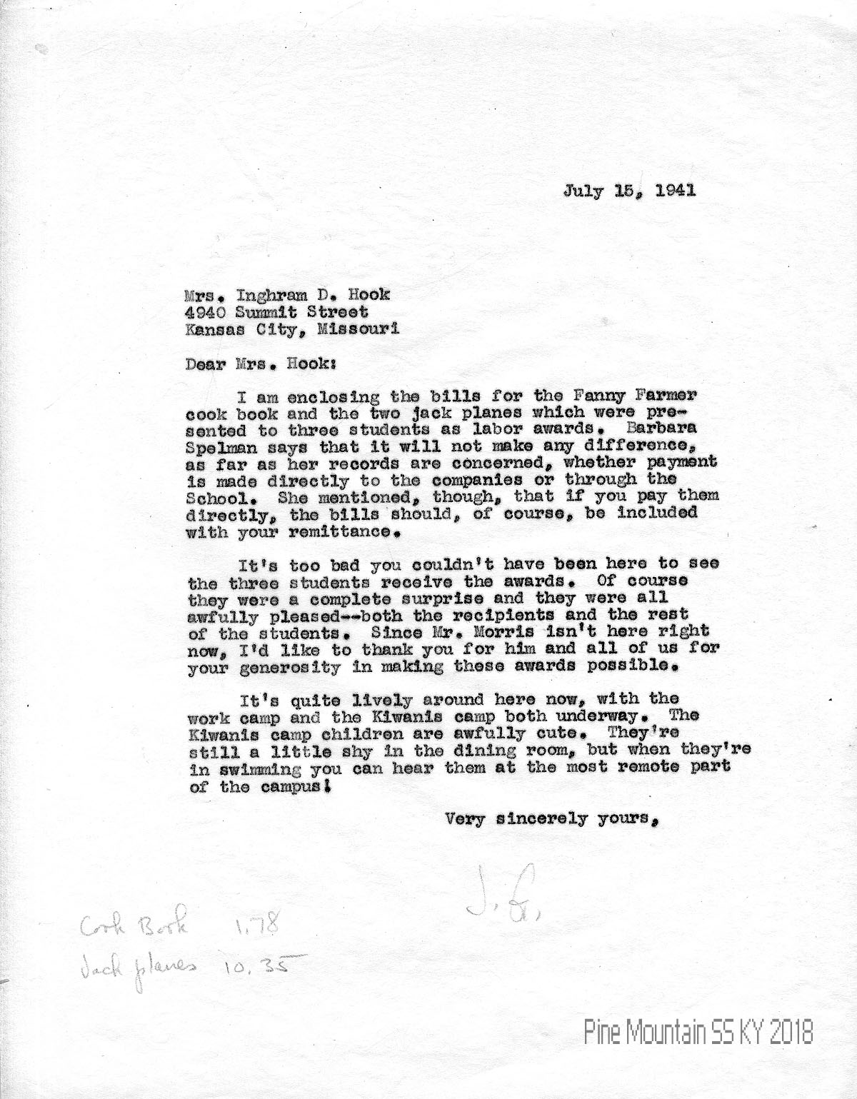 023 July 15, 1941. To Hook from (unsigned), enclosing bills for the students’ prizes, with Barbara Spelman’s advice on how to pay them. Describes how the students received their awards. “Since Mr. Morris isn’t here right now, I’d like to thank you for him and all of us for your generosity in making these awards possible.” Mentions work camp and Kiwanis camp.