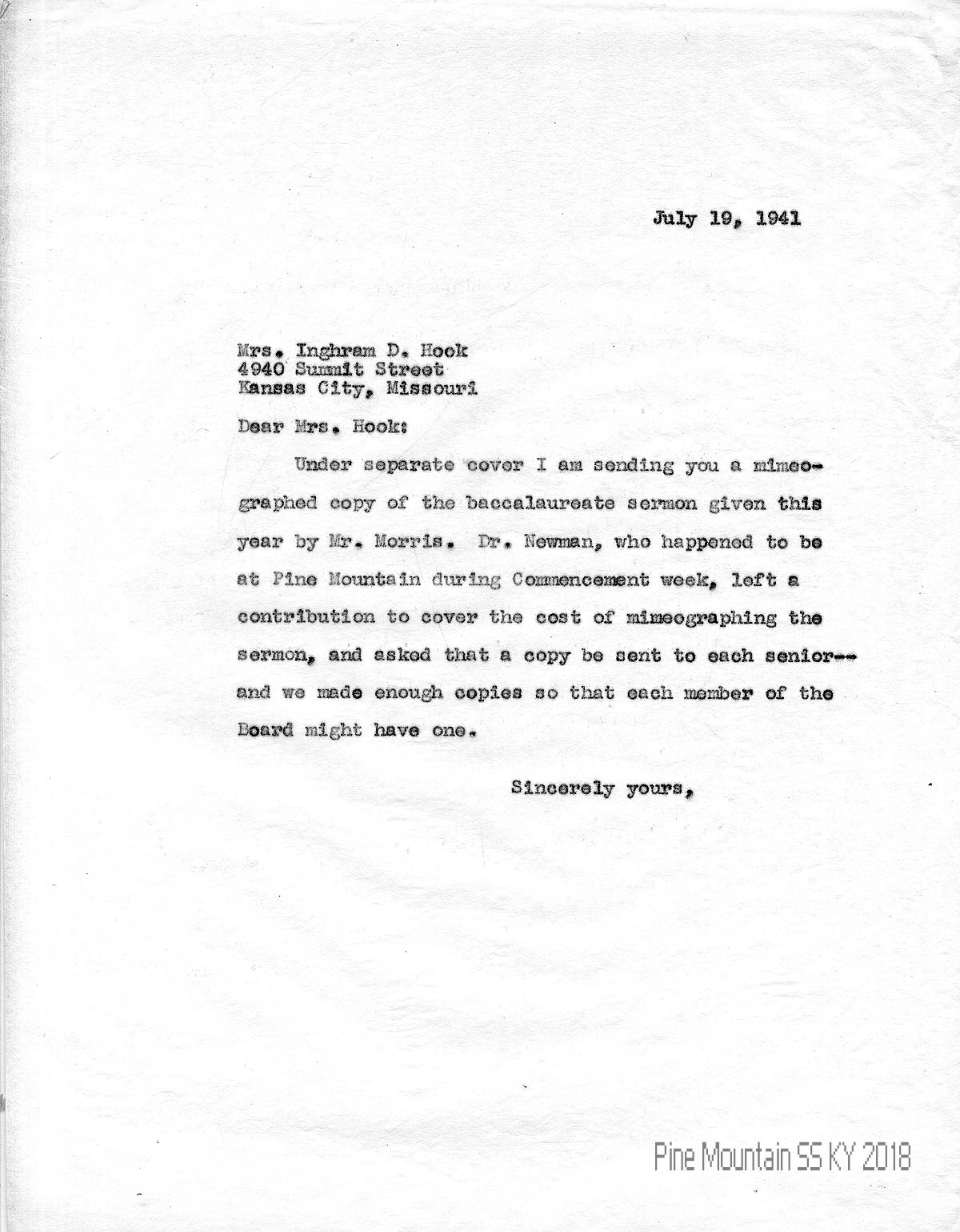 024 July 19, 1941. To Hook from (unsigned), who is sending a mimeograph of the baccalaureate sermon by Morris. The cost of the mimeographs for seniors and board members was covered by Dr. Newman, who was visiting at the time.