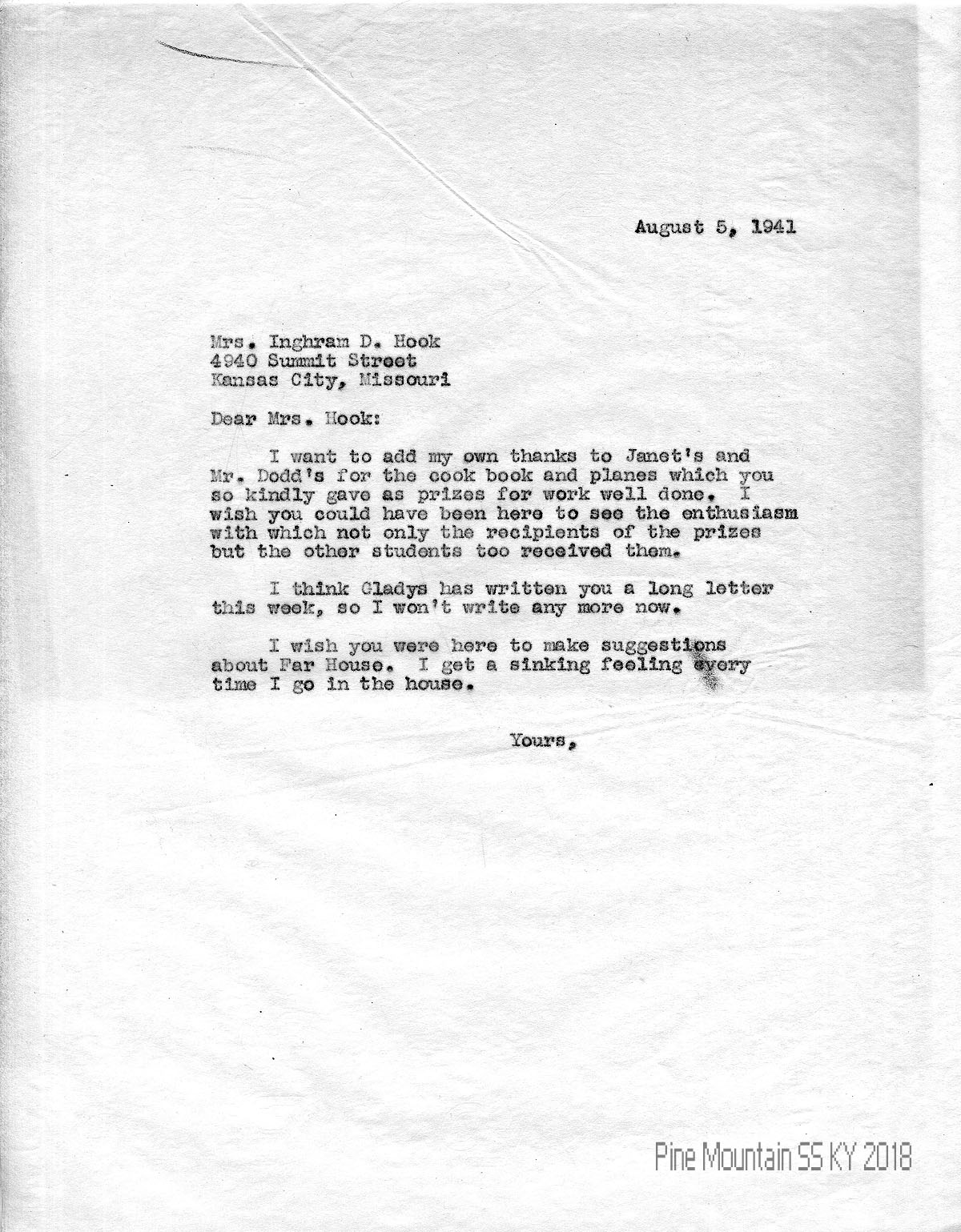 025 August 5, 1941. To Hook from (unsigned, likely Morris), adding his thanks to Janet’s and Mr. Dodd’s for the students’ prizes. “I wish you were here to make suggestions about Far House. I get a sinking feeling every time I go in the house.”