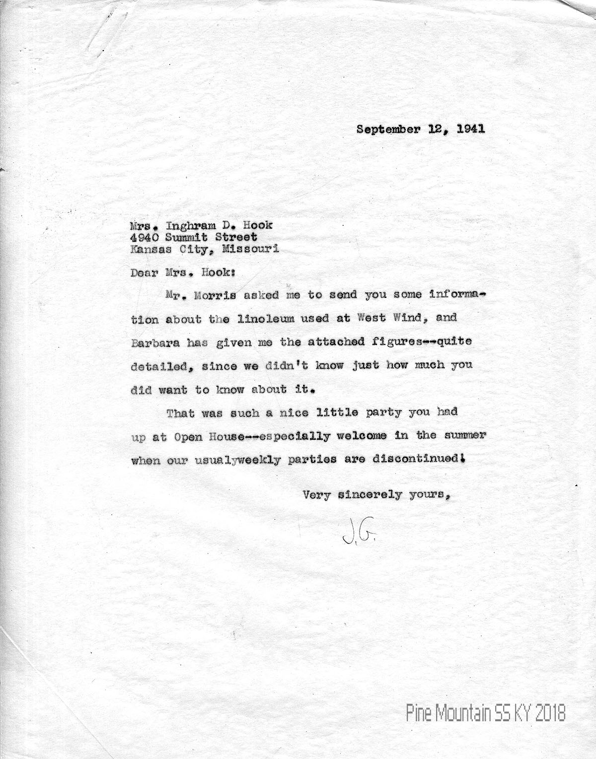 027 September 12, 1941. To Hook from “J.G.,” sending information about the linoleum in West Wind and figures from Barbara (Spelman). Appreciated the party that Hook held at Open House.