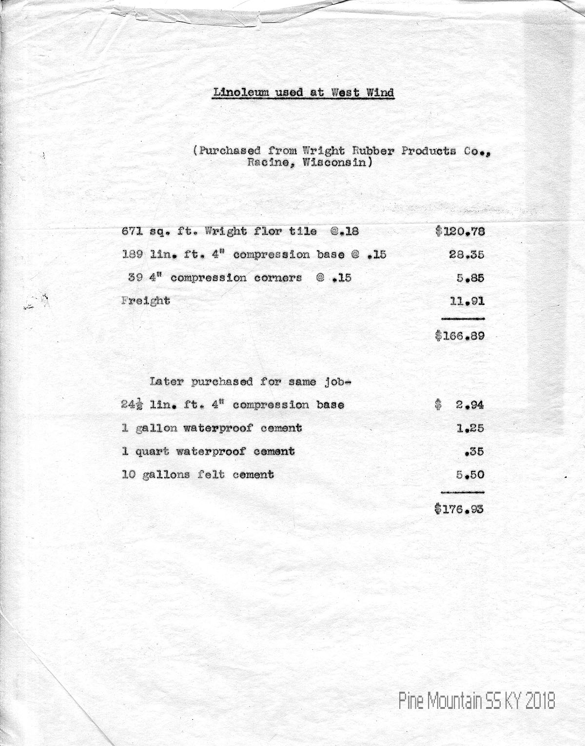 028 “Linoleum used at West Wind (purchased from Wright Rubber Products Col, Racine, Wisconsin),” with sizes, costs, and related items for the same job. 029 (Continuation of price list.)