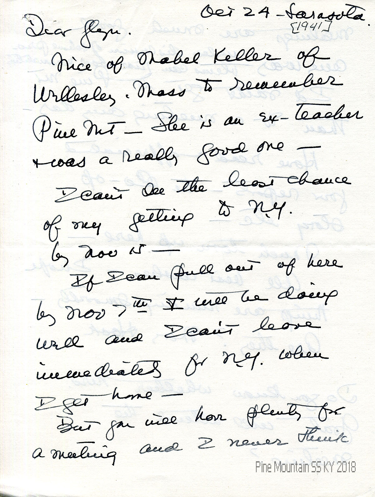030-030a October 24, (No year. Later notation: “1941”) Two-page letter from Hook in Sarasota, FL, to Morris. Encloses check from “Mabel Keller of Wellesley, Mass. She is an ex-teacher & was a really good one.” She cannot get to NY by November 15 meeting.