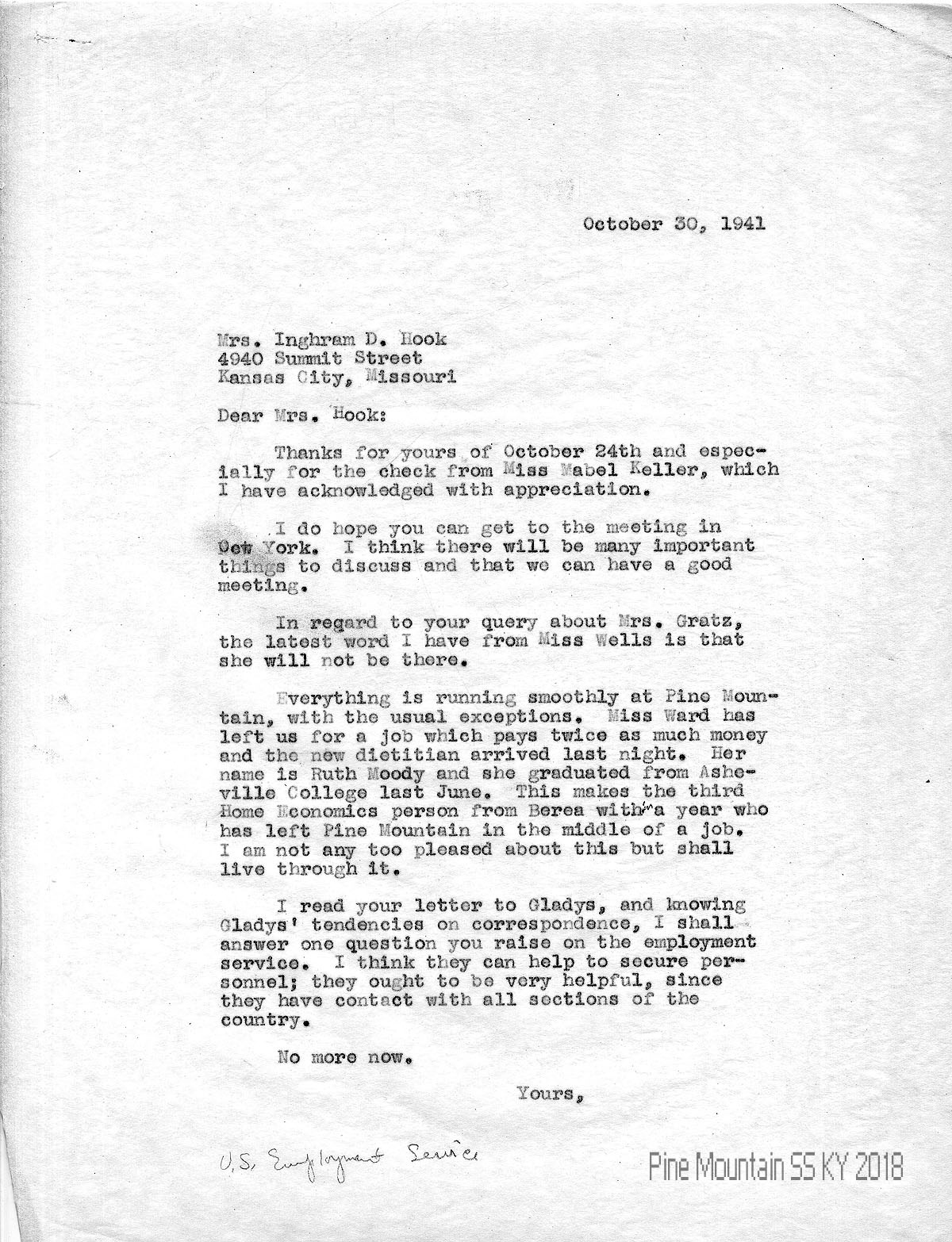 031 October 30, 1941. To Hook from (unsigned, likely Morris), thanking here for the check from Miss Mabel Keller. Provides PMSS updates: Miss Ward left for a higher-paying job and a new dietitian has arrived: Ruth Moody, who graduated from Asheville College in June. “This makes the third Home Economics person from Berea within a year who has left Pine Mountain in the middle of a job. I am not any too pleased about this but shall live through it.” Answers Hook’s question about the U.S. Employment Service.