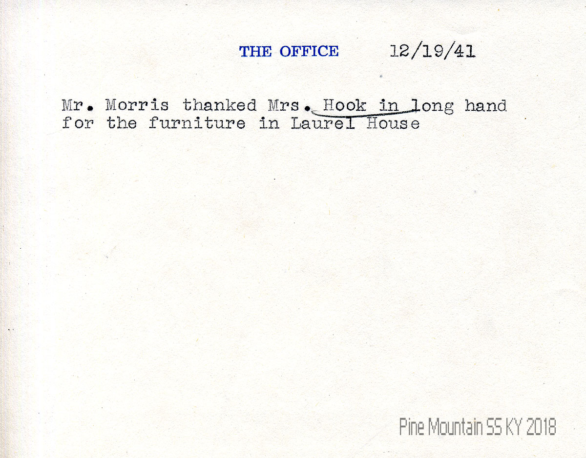 033 December 19, 1941. Typewritten message on “The Office” notepaper: “Mr. Morris thanked Mrs. Hook in long hand for the furniture in Laurel House.”