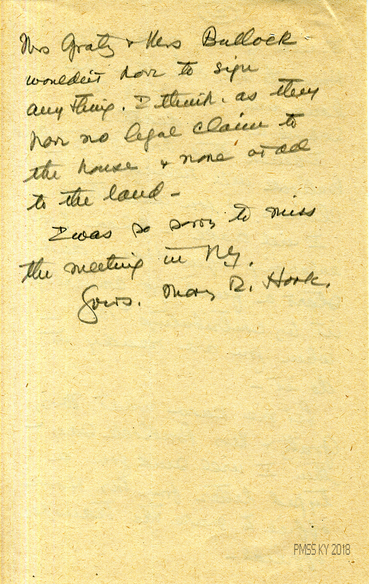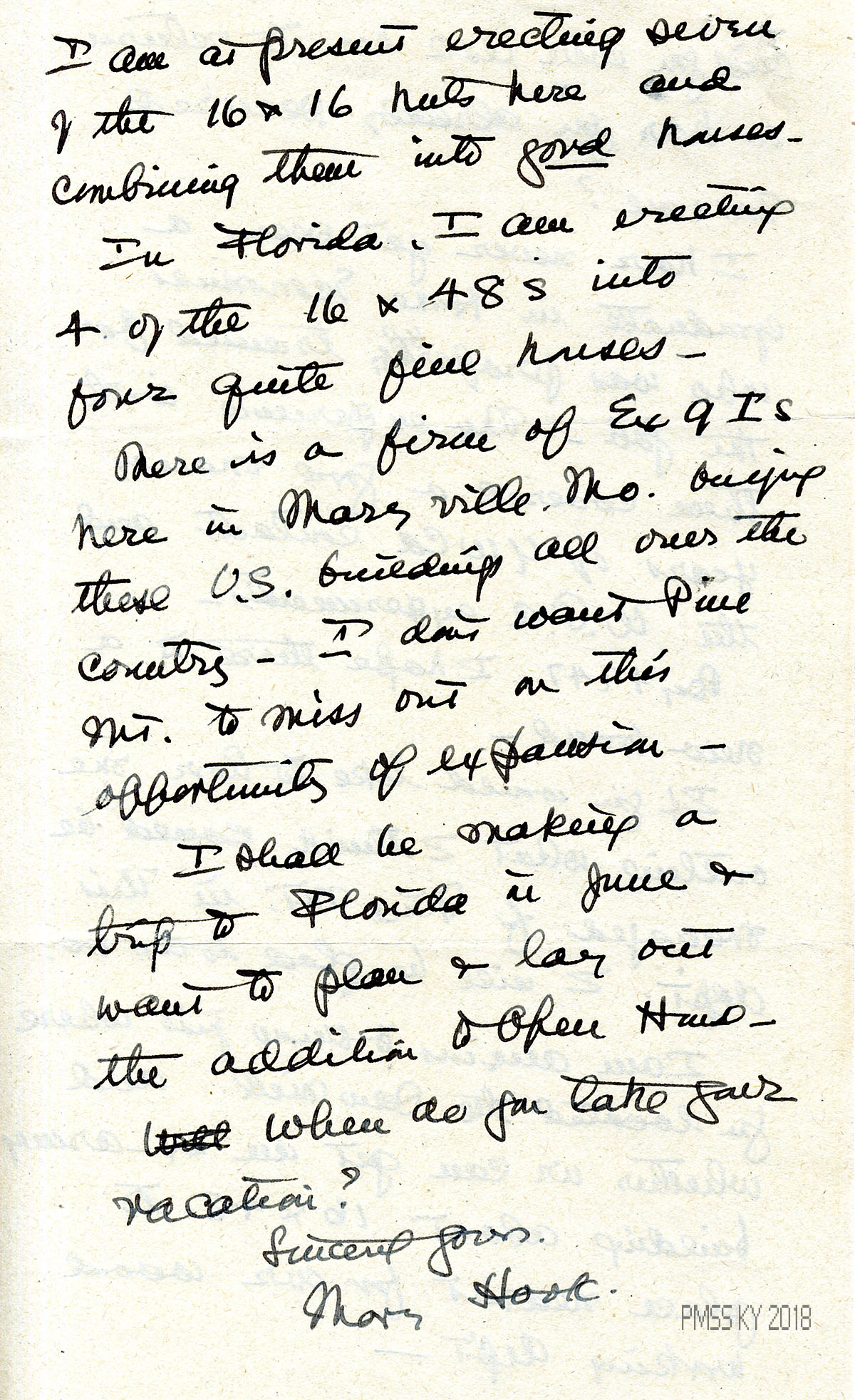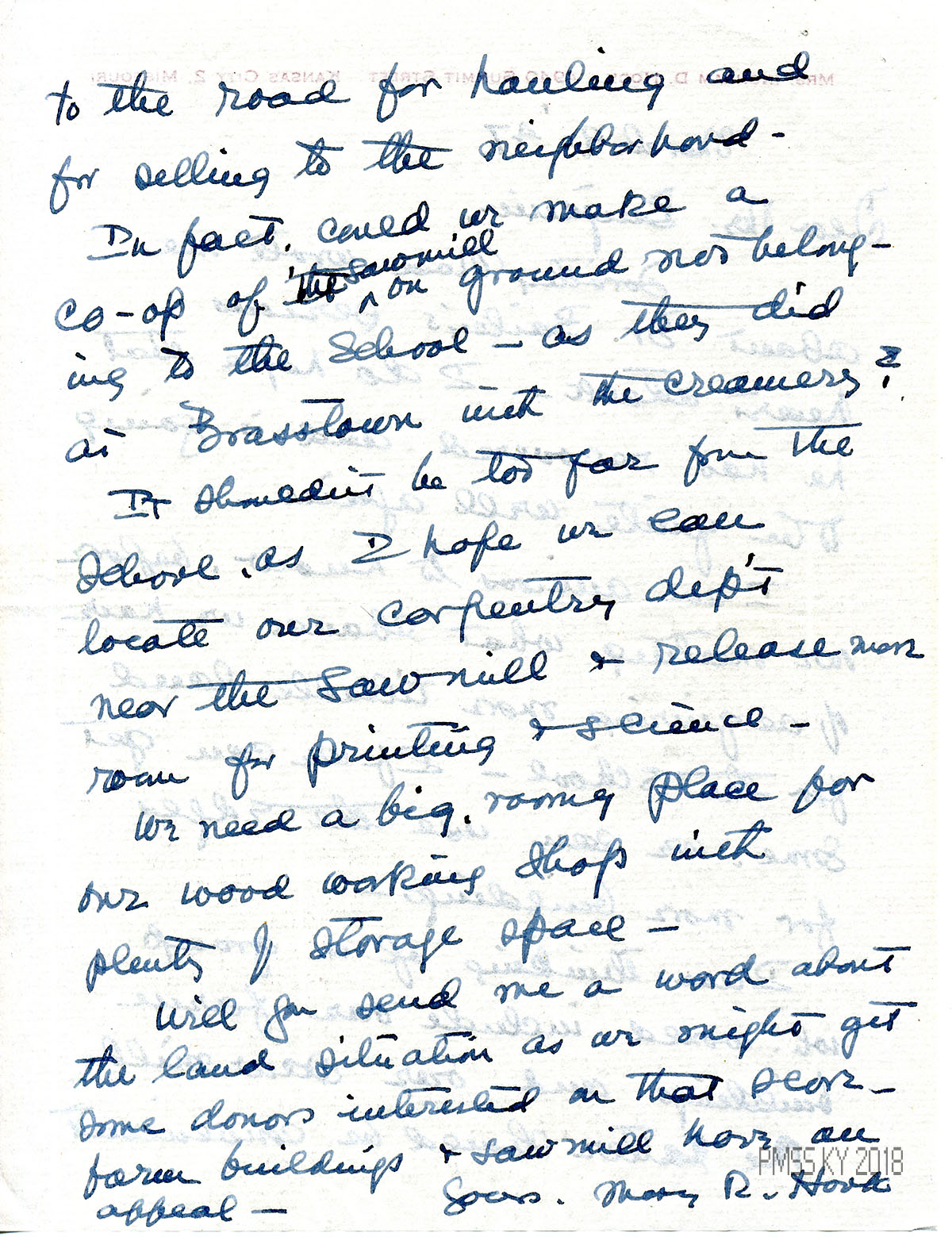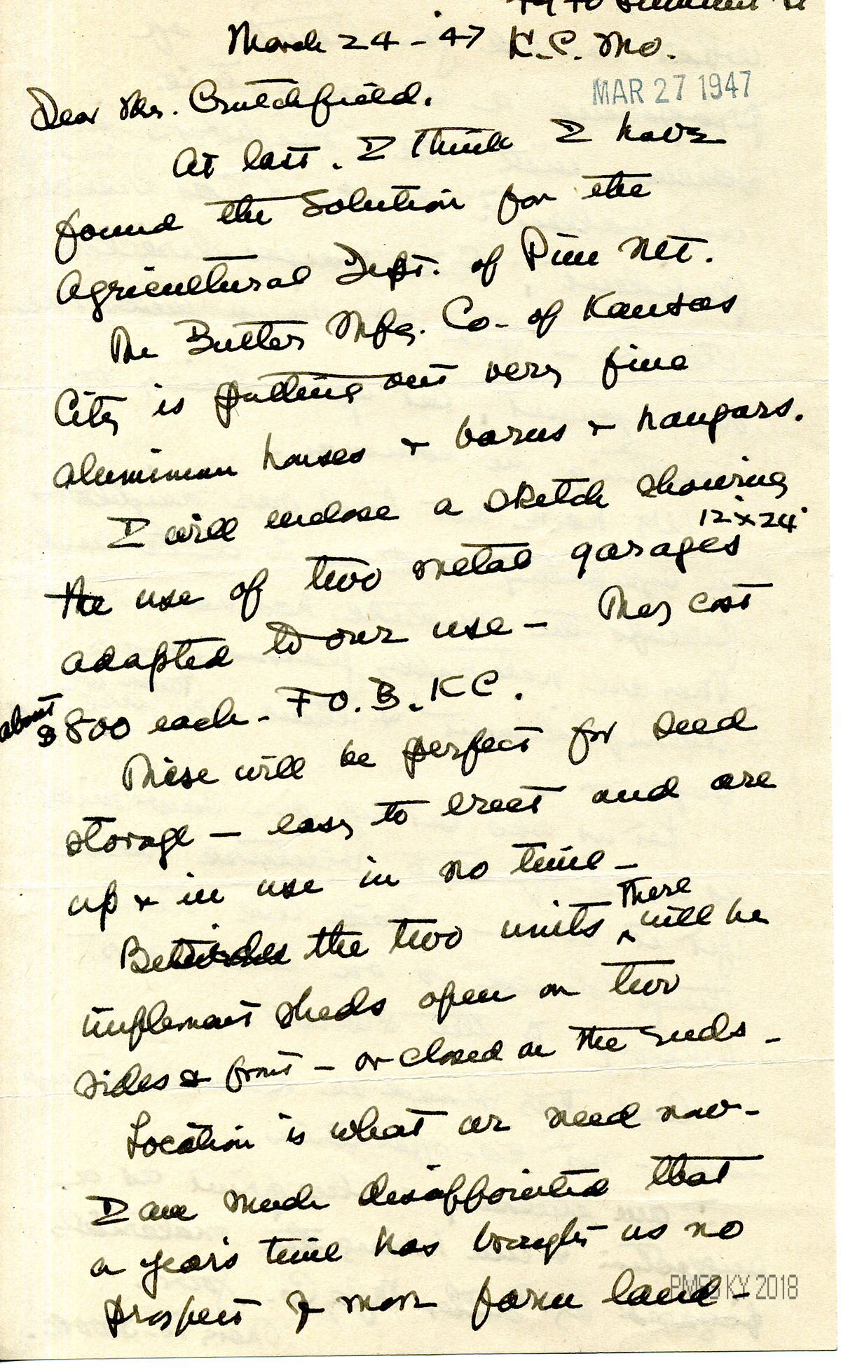 07-08 March 24, 1947. Two-page letter to Mr. (James S.) Crutchfield from Hook, [07] who recommends two aluminum buildings for a sawmill and seed storage by PMSS’s Agricultural Department, made by the Butler Mfg. Co. of Kansas City at $800 each. She describes the buildings, which need a location. “I am much disappointed that a year’s time has brought us no prospect of more farm land.” [08] Hook proposes a co-operative scheme with the neighbors and suggests Charles Creech as president and Bill Hayes as director; set up on land not belonging to the School. “We have not had our neighbors in sympathy with us to date and perhaps the mistake has been ours. They are naturally jealous of our accomplishment & think we think we are superior.” She encloses a blueprint and is asking the Butler Mfg. Co. for figures.