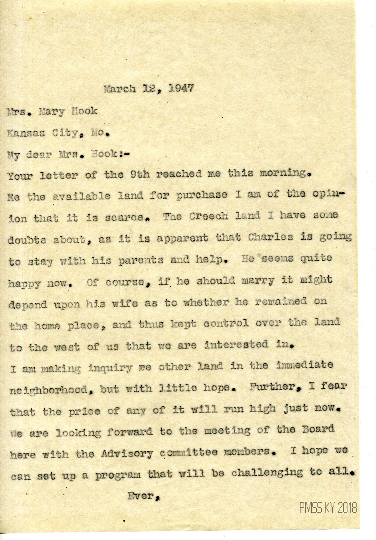 06 March 12, 1947. To Hook from (unsigned, apparently Mr. Benjamin), explaining that land for purchase is scarce. Charles (Creech) is staying with his parents on the Creech land, controlling the land to the west of the School. Benjamin is asking about other land in the neighborhood, “but with little hope.” He looks forward to the Board meeting with the Advisory Committee members.