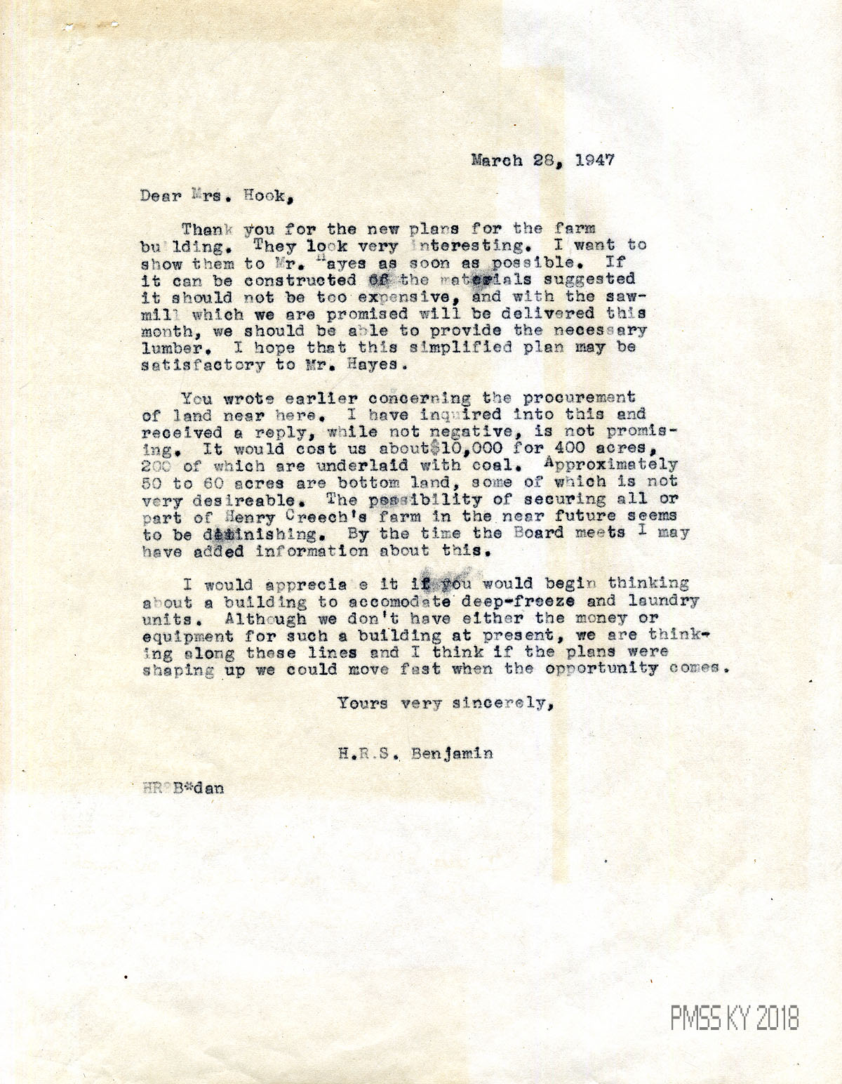 09 March 28, 1947. To Hook from Benjamin, thanking her for the plans for the farm building. He will show them to Mr. Hayes. The sawmill, which will be delivered this month, would provide the lumber. He tells of land that he has found available and its cost, although it is “not promising.” Asks Hook to think “about a building to accommodate deep-freeze and laundry units” even though there is no money or equipment for it yet.