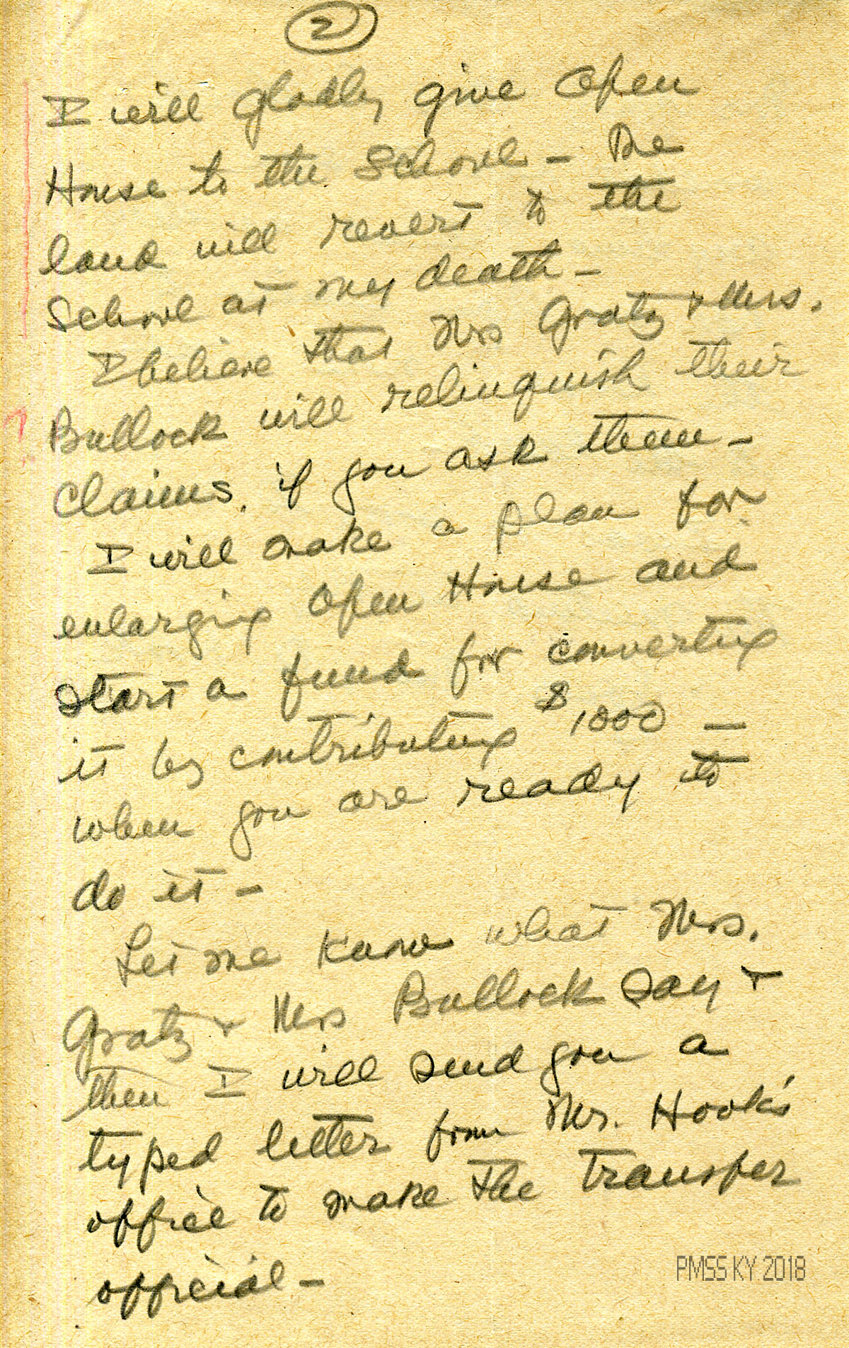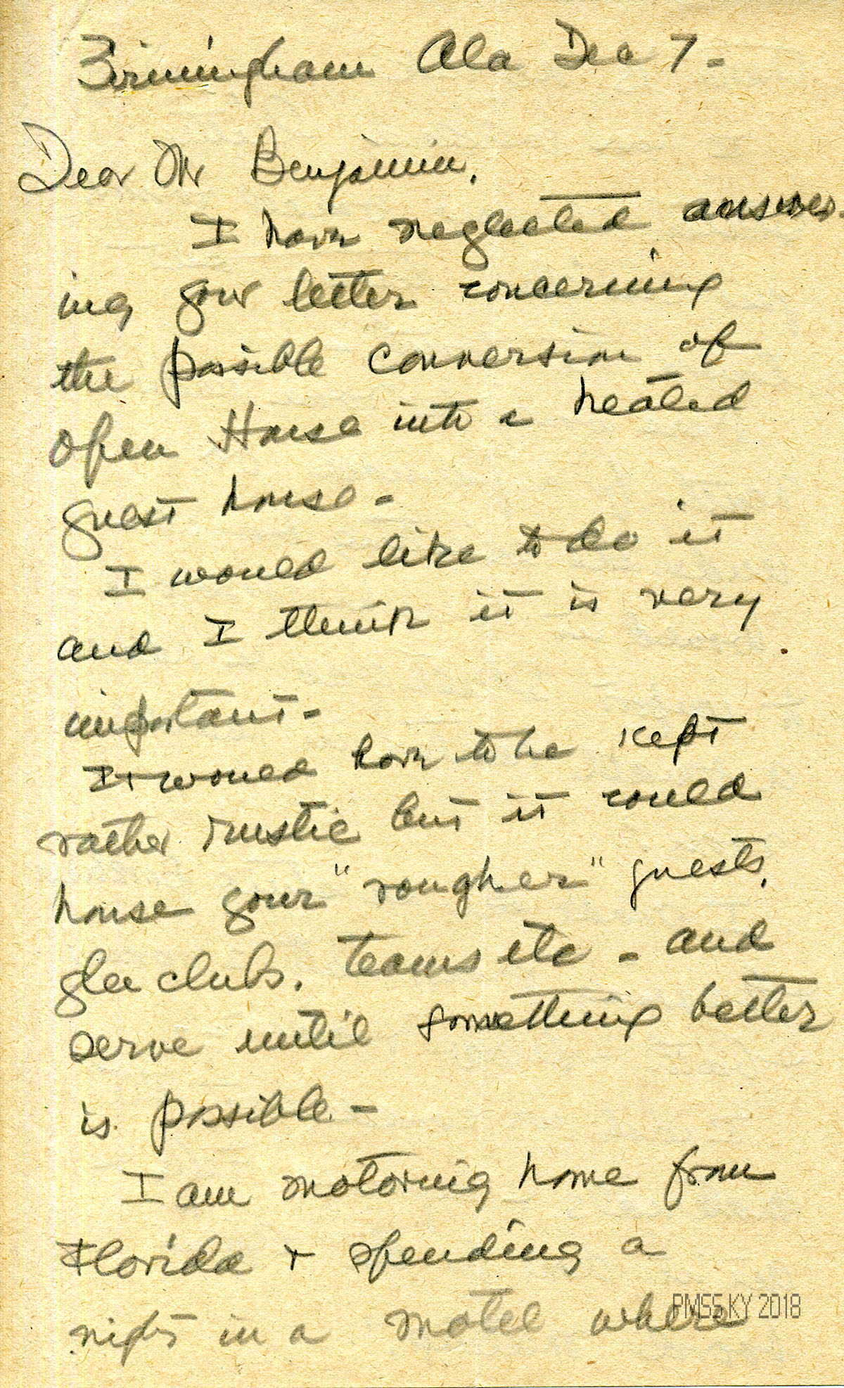 10-14 December 7, (no year). Five-page letter to Benjamin from Hook, [10] answering his letter about converting Open House into a heated guest house with which she agrees. “It would have to be kept rather rustic but it could house your ‘rougher’ guests, glee clubs, teams, etc….” [11-12] She provides a sketch (12 single rooms and 4 baths) and explains how it could be done. [13] “I will gladly give Open House to the School, The land will revert to the School at my death. I believe that Mrs. (Fanny) Gratz & Mrs. Bullock will relinquish their claims, if you ask them.” Hook offers to make a plan to enlarge Open House and start a fund by contributing $1,000 when the conversion begins. [14] Hook thinks that Mrs. Gratz and Mrs. Bullock “have no legal claim to the house & not at all to the land.”