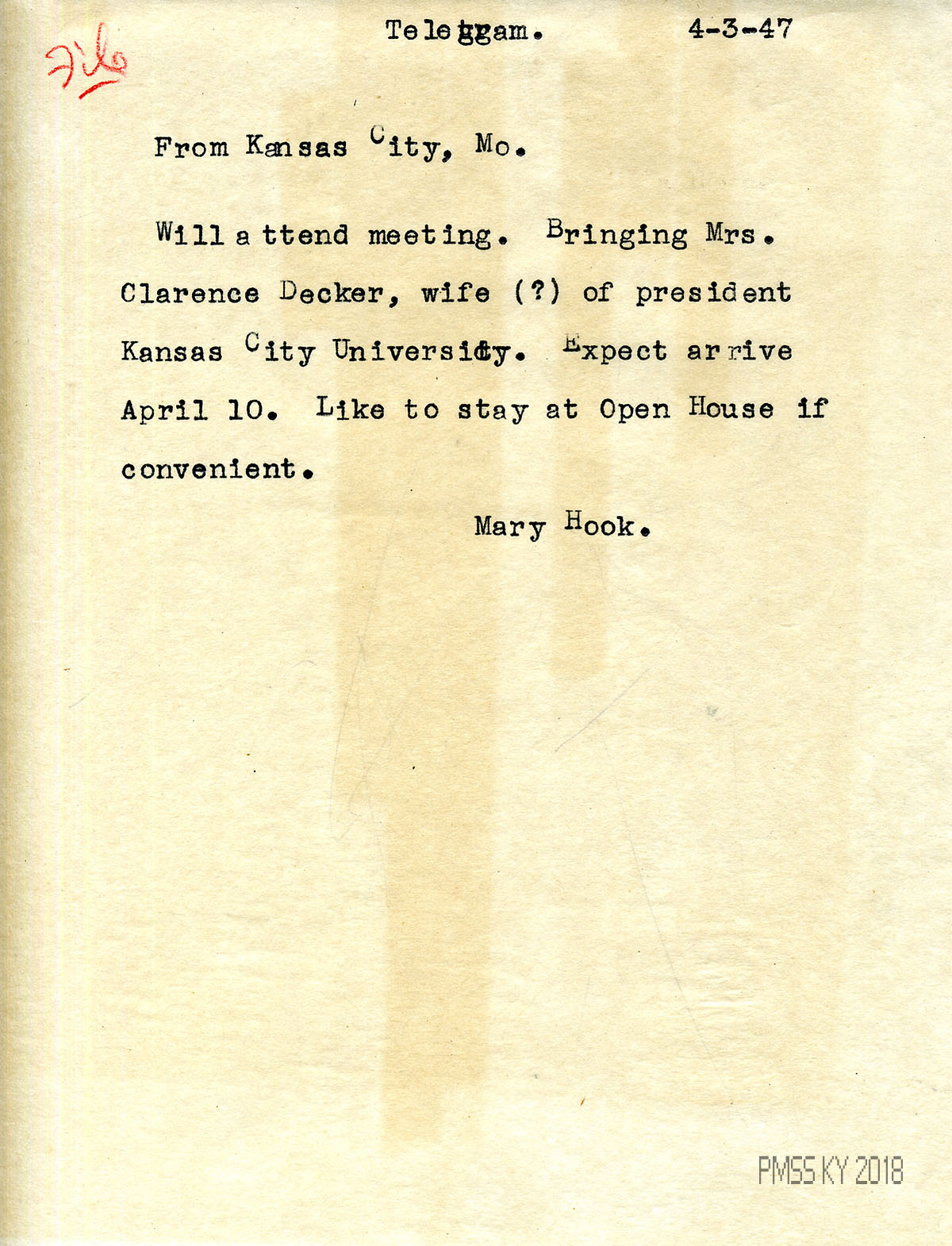 15 April 3, 1947. Western Union telegram to Benjamin from Hook, informing him that she will attend the Board meeting; will bring Mrs. Clarence Decker, wife of the President of Kansas City University. She hopes to stay at Open House.