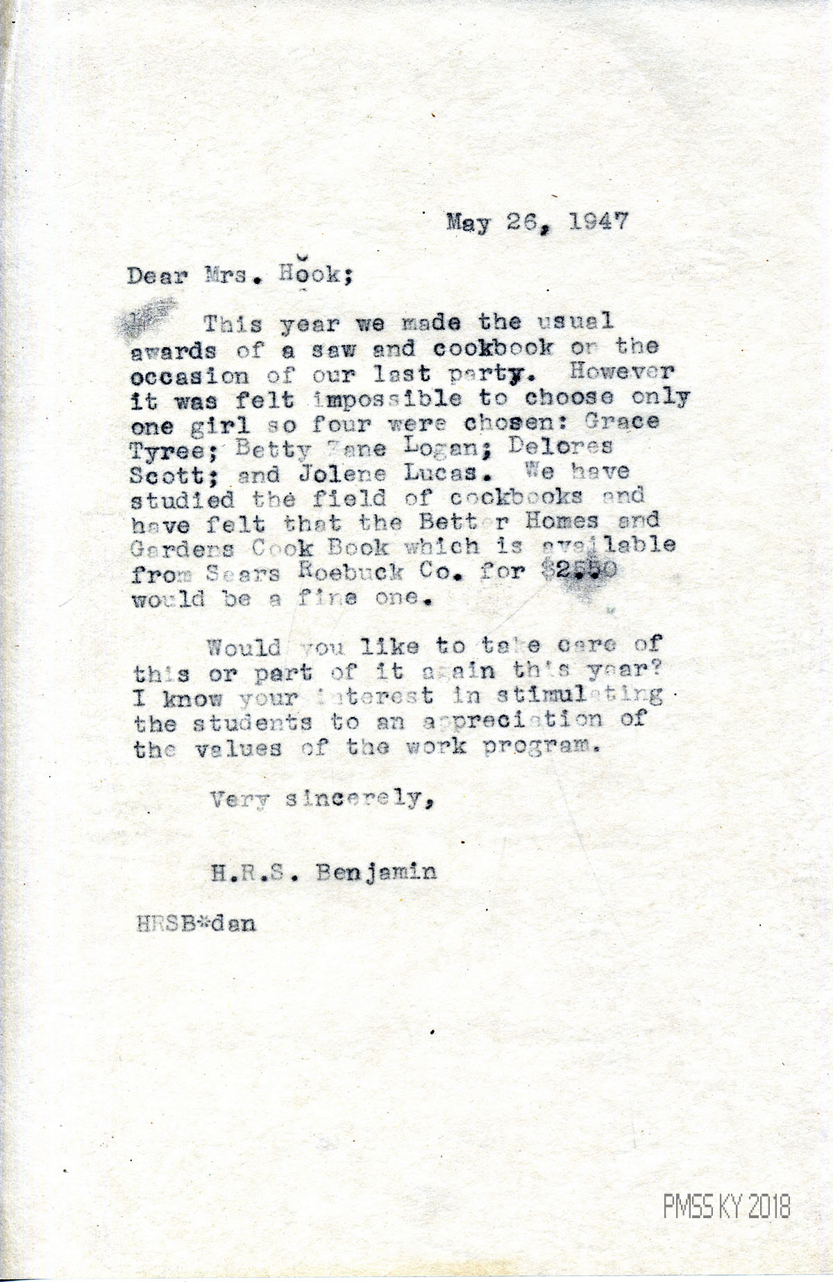18 May 26, 1947. To Hook from Benjamin, who lists the four girls chosen for the worker awards; Grace Tyree, Betty Jane (Zane?) Logan; Delores Scott, and Jolene Lucas. The award will be the Better Homes and Gardens Cookbook; Benjamin asks Hook if she would “like to take care of this or part of it again this year? I know your interest in stimulating the students to an appreciation of the values of the work program.”