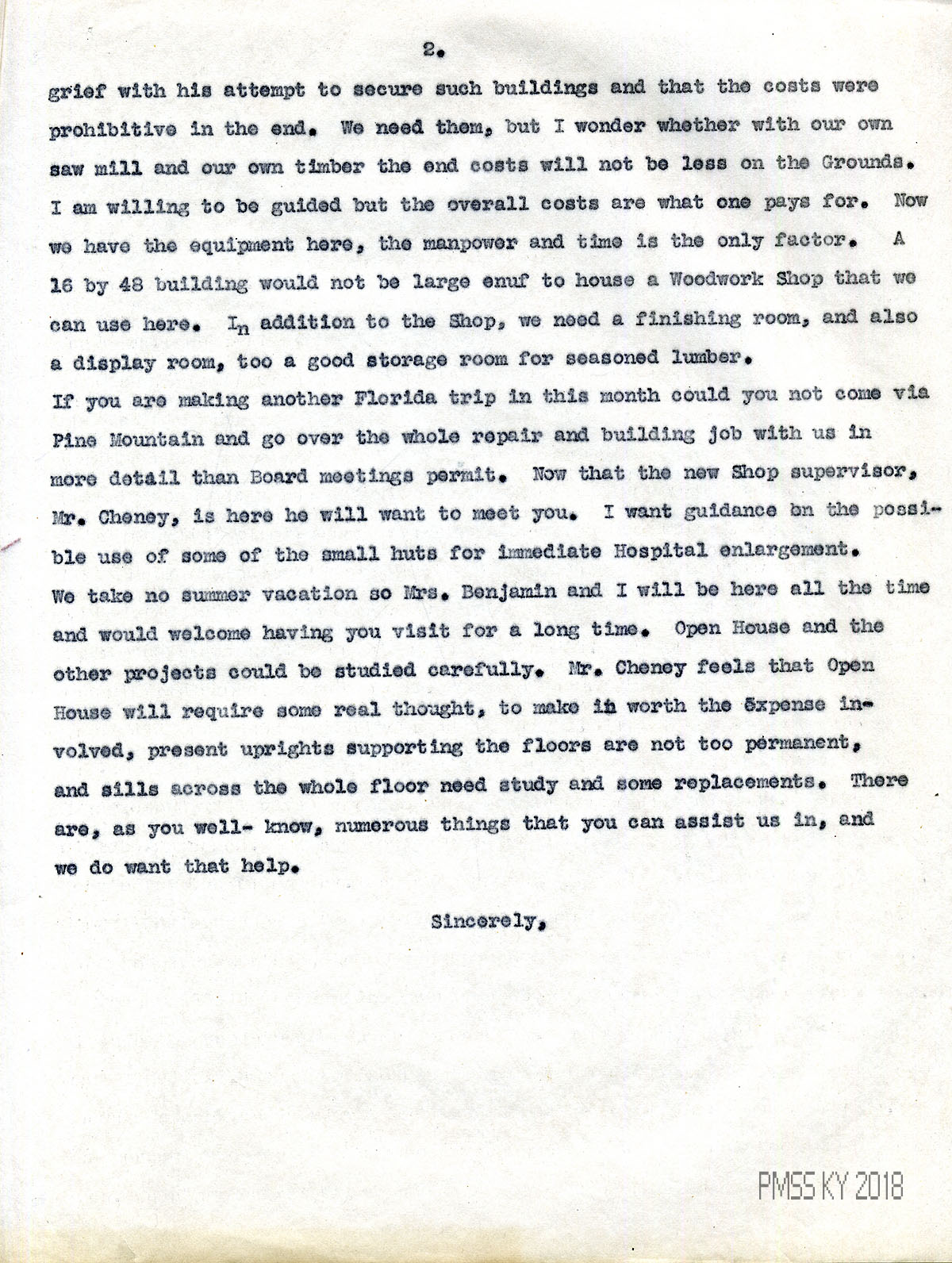 23-24 June 5, 1947. Two-page letter to Hook from (unsigned, apparently Benjamin), who responds to her June 1 letter, showing interest in all that she suggests. [23] He agrees that home economics and kitchen of Laurel House need improvement. Now that Miss (Helen) Kingsbury of the home economics department is leaving, he can make personnel changes. Miss Kingman has been approached several times to return to PMSS to no avail. “The sawmill is located in the old spot, up the Hollow, but a bit higher.” Asks if the ex-Army buildings might be expensive. [24] Describes the building that the Woodwork Shop needs, which could be less expensive if built locally. Asks her to visit PMSS to discuss a hospital enlargement using the huts and to meet Mr. (Frank W.) Cheney, the new Shop supervisor; also to study Open House needs.