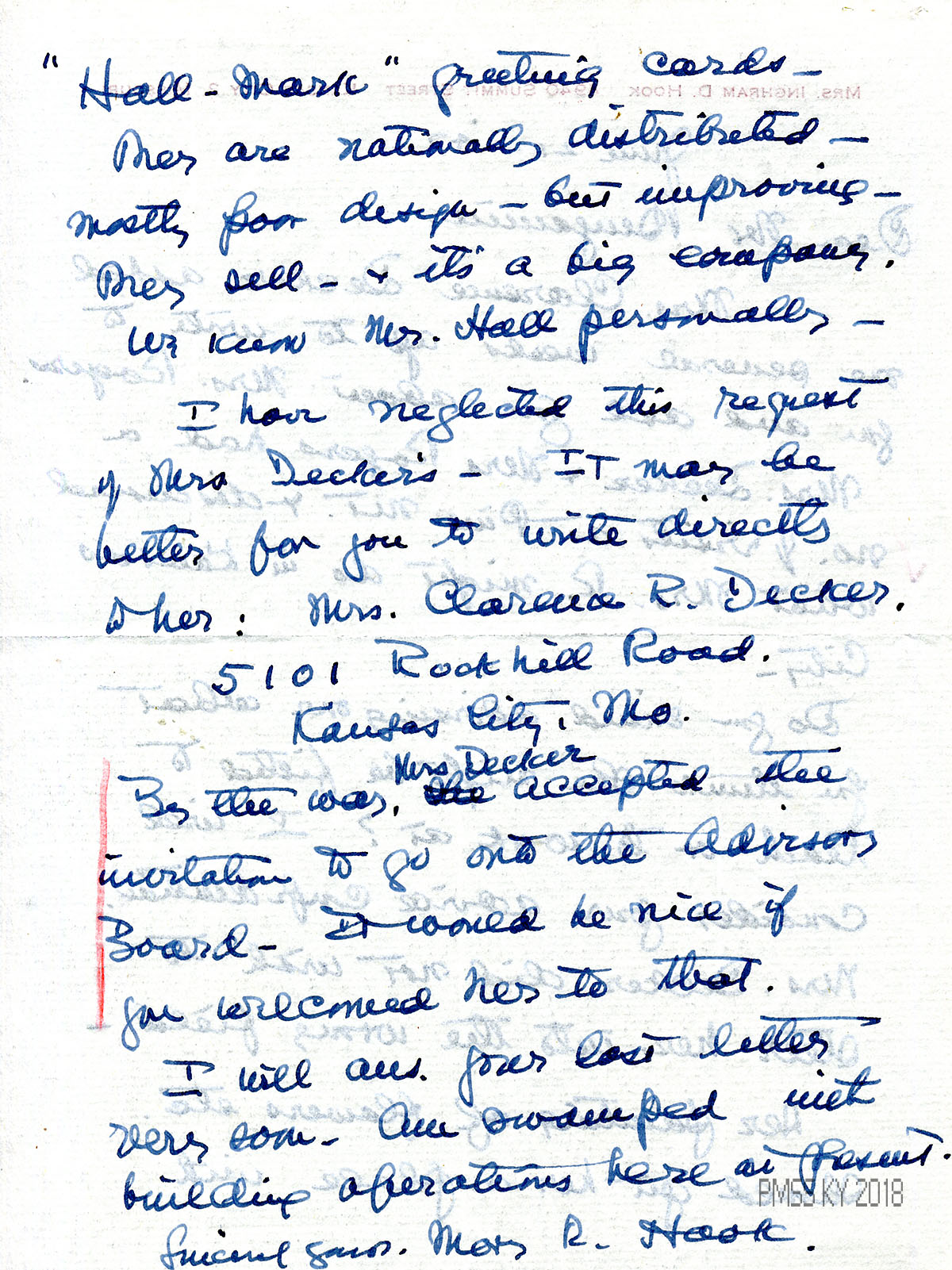 25-26 June 21, 1947. Two-page letter to Benjamin from Hook, [25] asking his advice concerning Mrs. (Mary Cook) Rogers’ abilities so that Mrs. Clarence Decker can find the right place for her in Kansas City. [26] Suggests Mrs. Rogers’ artistic talent could be applied to “Hall-Mark” greeting cards. Hook knows Mr. Hall personally. Mrs. Decker accepted an invitation to join the Advisory Board.