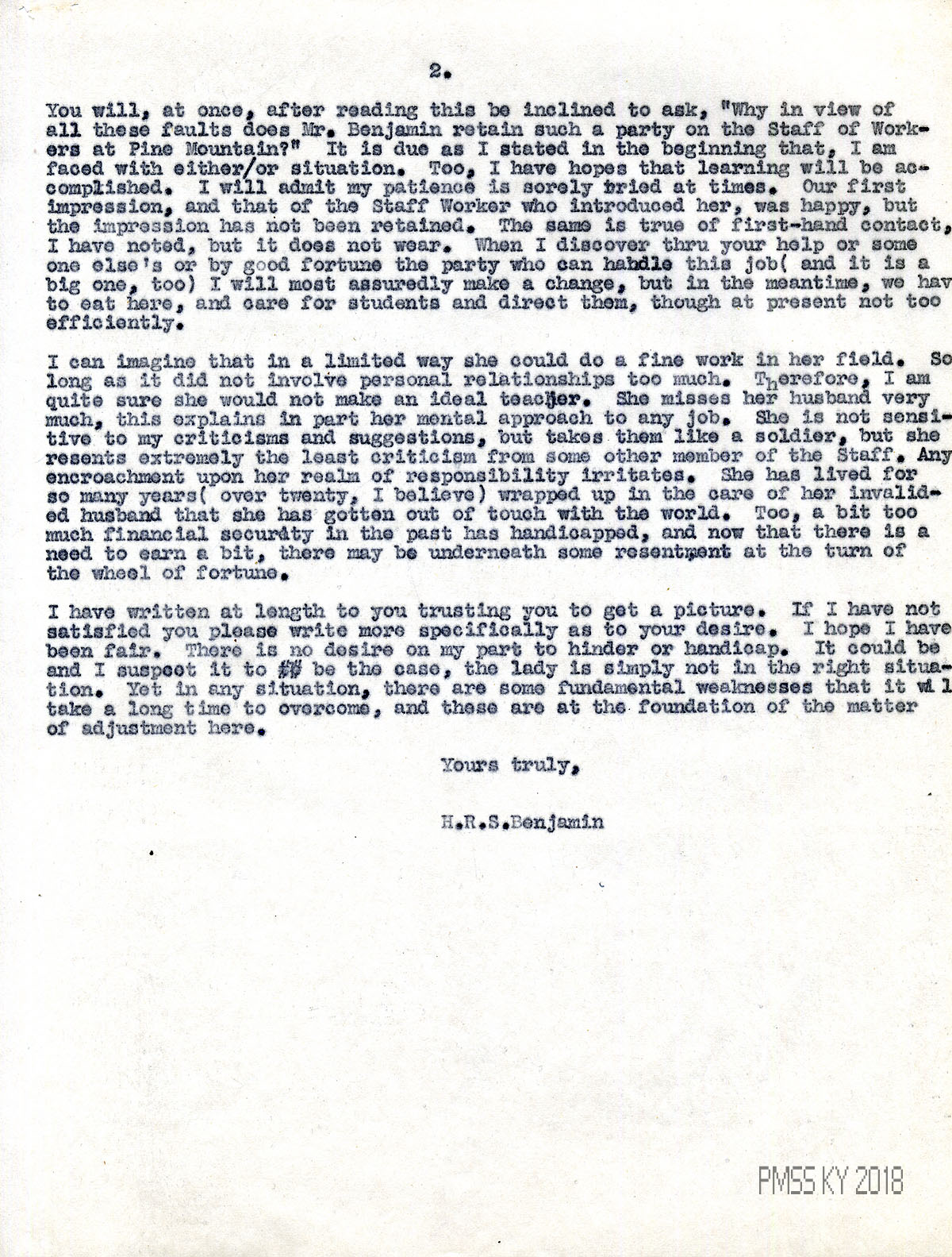 27-28 June 26, 1947. To Hook from Benjamin, [027] who responds to Hook’s “confidential inquiry concerning Mrs. Mary Rogers. …[S]he is the only person on our Staff of Workers who is prepared to handle Laurel House as dietitian and house manager. If you provide a way…for her to leave us, we will be in a very serious situation.” He then gives his thoughts on her qualifications. [028] He is willing to change to another employee if Hook or someone else finds someone else who can handle the job.