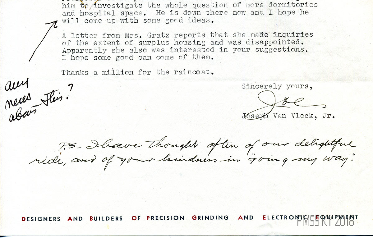 29 N.D. A partial typewritten letter from Joseph Van Vleck, Jr., concerning additional dormitories and hospital space, with a notation in Hook’s handwriting stating: “Any news about this?”
