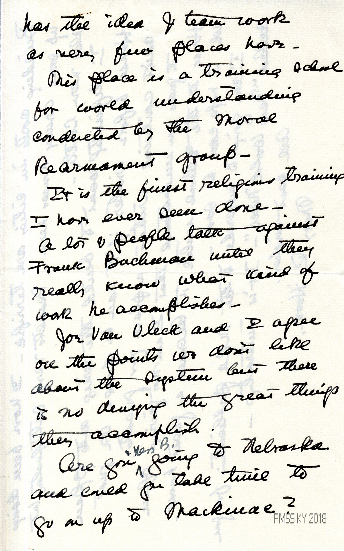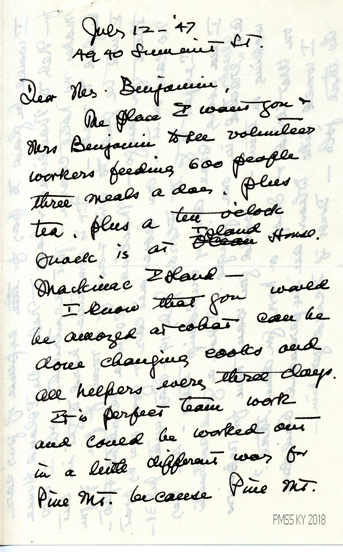 30-33 July 12, 1947. Four-page letter to Benjamin from Hook, [30] who wants Mr. and Mrs. Benjamin to see Island House on Mackinac Island (Michigan), where volunteer workers efficiently feed 600 people by changing cooks and all helpers every three days. She suggests their methods for PMSS. [32 – numbering is out of order] Describes Island House as “a training school for world understanding conducted by the Moral Rearmament group” run by Frank Buchman. [31] Offers to pay for their travels and hotel. Hook describes Island House and the island. She will be in Florida soon; is using four army buildings there. [33] Hook wants to build the wing for guests onto Open House before winter. She is not giving Open House to the School until it becomes a guest house. She is subscribing to “New World News” for Benjamin.