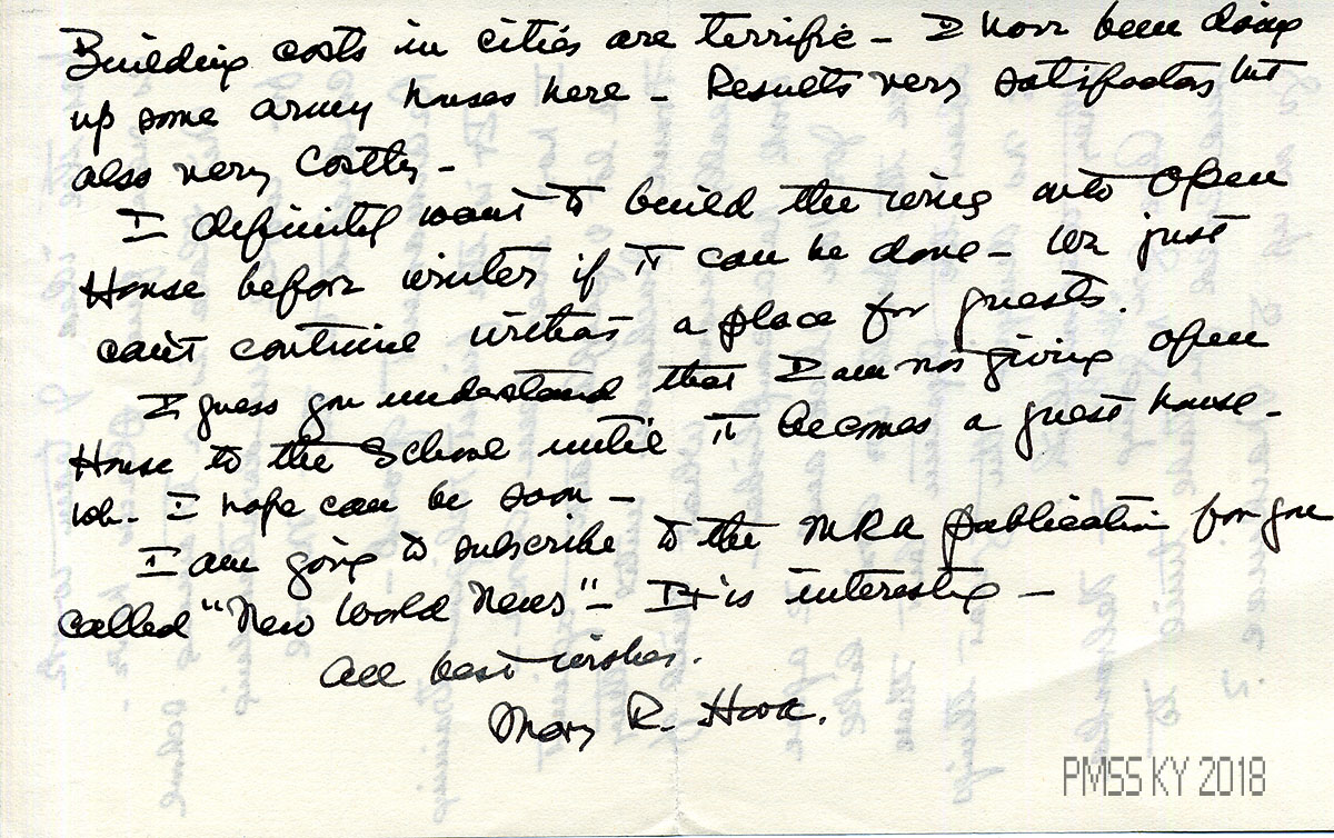 19-22 June 1, 1947. Four-page letter to Benjamin from Hook in Kansas City, MO, [19] who encloses a $12.50 check for the saw and cookbook awards. She hopes to discuss the home economics department with Benjamin. “We have never yet had the strong department that I am ambitious to make of it.” [20] Suggests combining “teaching of cooking with the actual work of feeding the whole family.” Hook hopes to show Mr. and Mrs. Benjamin a place that could be a pattern for PMSS. Mr. Crutchfield and Hook are trying to persuade Marian Kingman, who is head of the Berea College home economics department, to return to PMSS for a year. She is also a musician who could fill in for (Arthur) Dodd in his absence. [21] Hook offers to create an outline of how to manage home economics at PMSS. Asks where the sawmill has been located and whether an ex-Army building can be used for wood storage. [22] Hook is currently erecting seven of the huts in Kansas City and four in Florida, combining them into houses. She will be planning an addition to Open House.