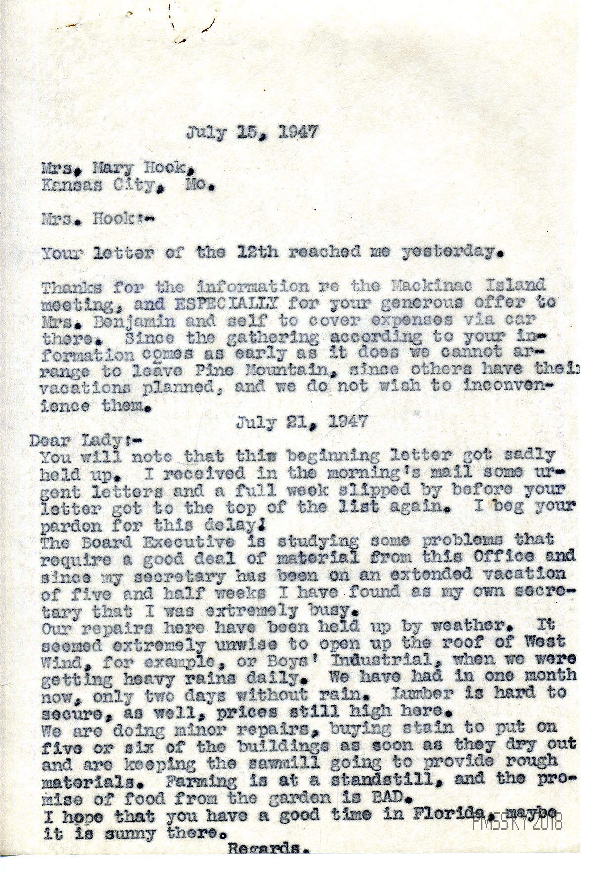 34 July 15, 1947. To Hook from (unsigned, apparently Benjamin), who declines a trip to Mackinac Island because he can’t leave PMSS. July 21, 1947. (He resumes his letter after a delay.) Roof repairs on West Wind and Boys’ Industrial were held up due to daily heavy rains, which is also affecting farming.