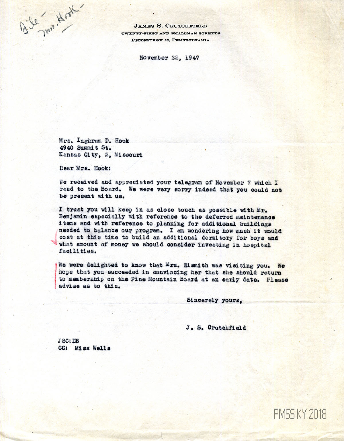 35 November 22, 1947. To Hook from James S. Crutchfield, Pittsburgh, PA, (with a copy to Miss [Evelyn K.] Wells), who regrets she missed the board meeting. He trusts Hook is keeping in touch with Mr. Benjamin about maintenance and planning for additional buildings. He asks about the cost to build an additional dormitory for boys and hospital facilities. He hopes Hook can convince Mrs. (Dorothy Olcott) Elsmith to return to the PMSS Board.