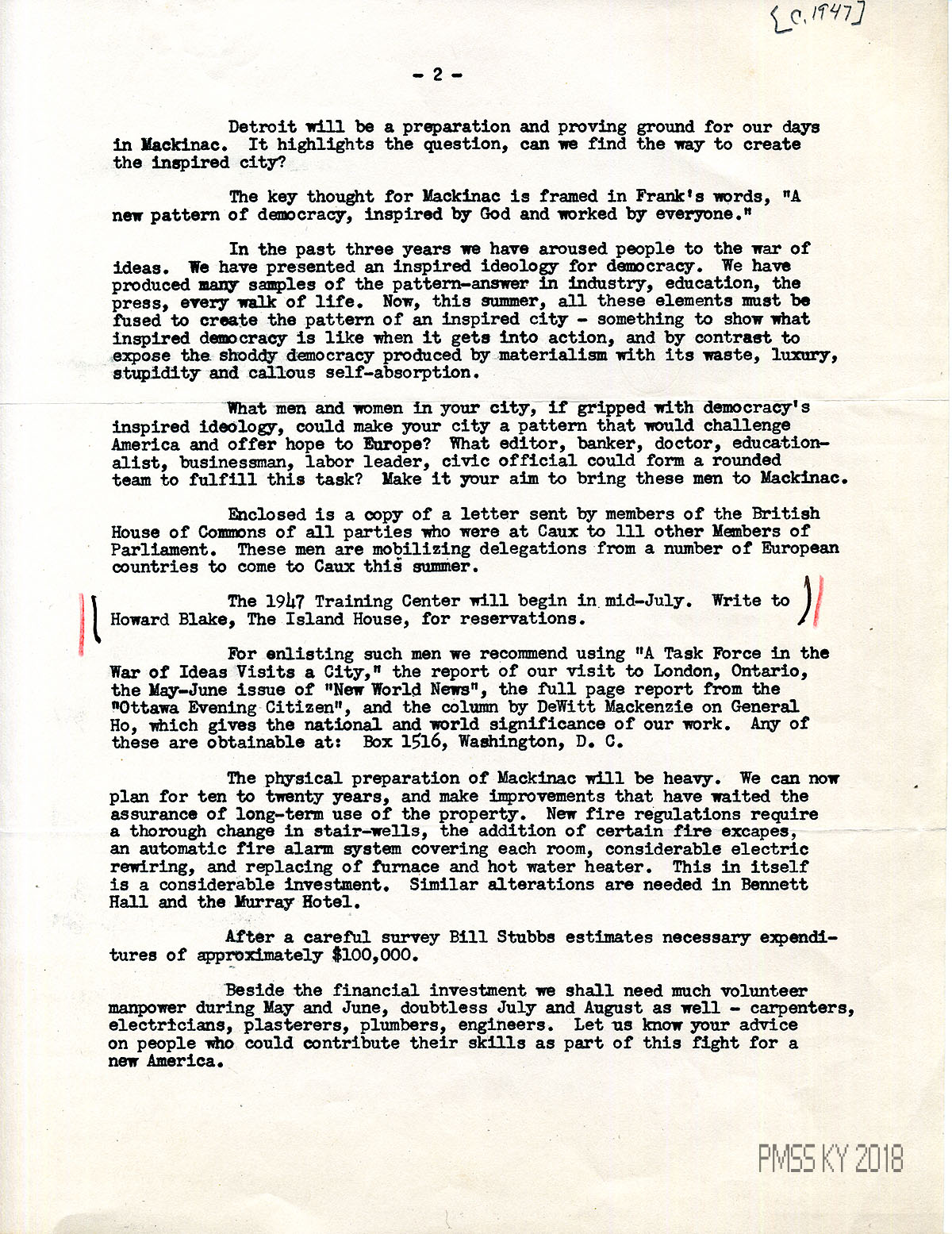 36 N.D. (Later notation: “c.1947”) Second page of a letter about creating an “inspired city” in Mackinac incorporating “a new pattern of democracy….” and including training, volunteer manpower, and preparation of the buildings.