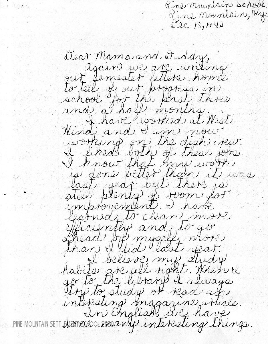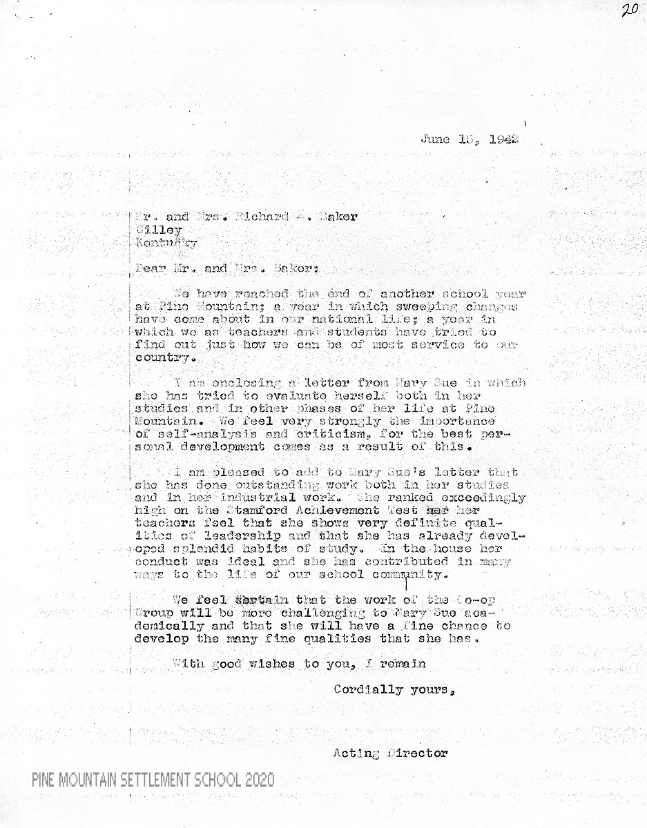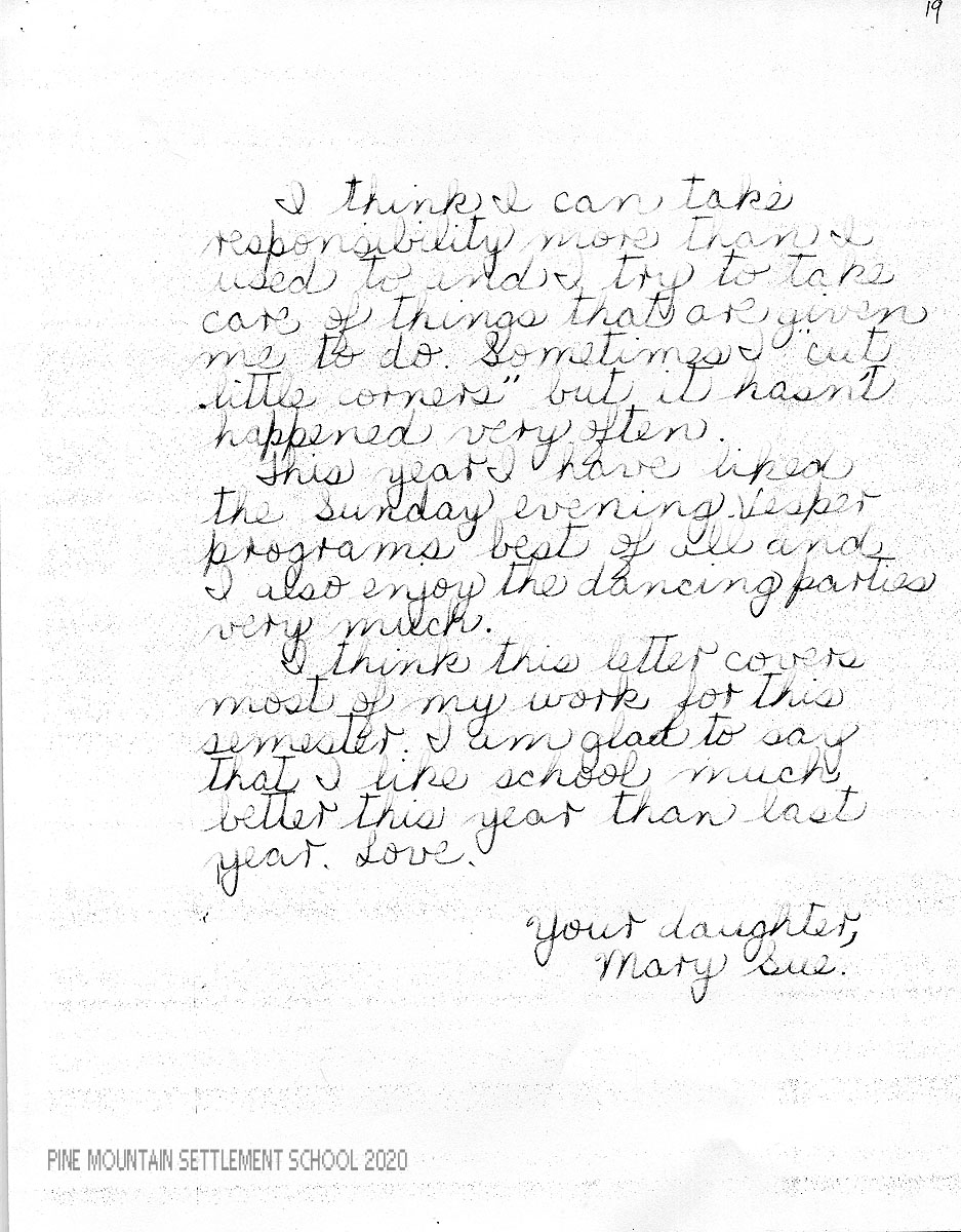 I am enclosing a letter from Mary Sue in which she has tried to evaluate herself both in her studies and in other phases of her life at Pine Mountain. We feel very strongly the importance of self-analysis and criticism, for the best personal development comes as a result of this.