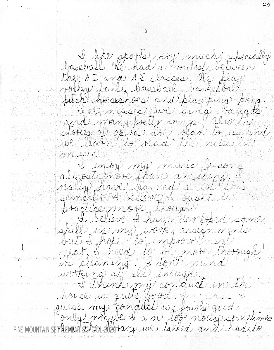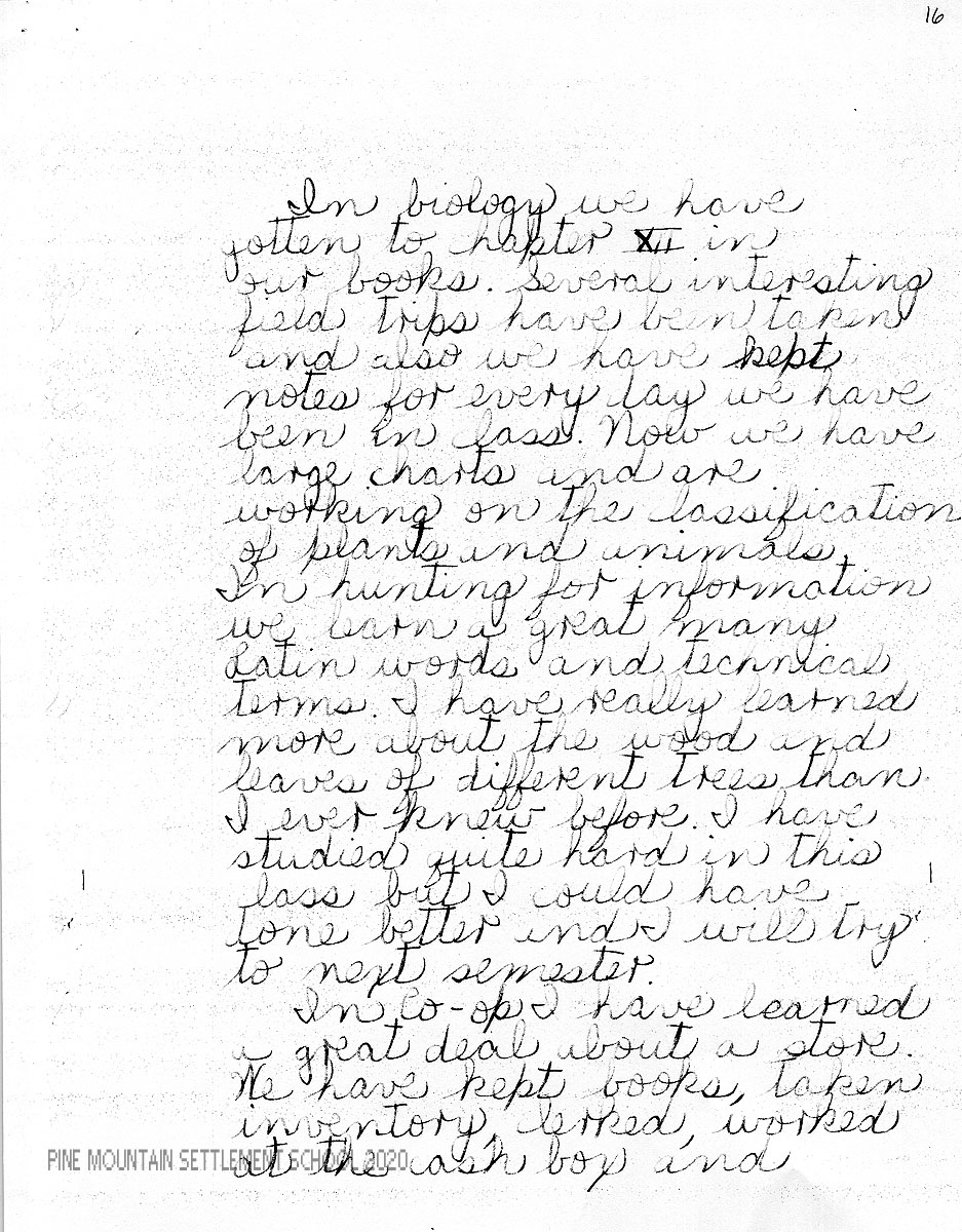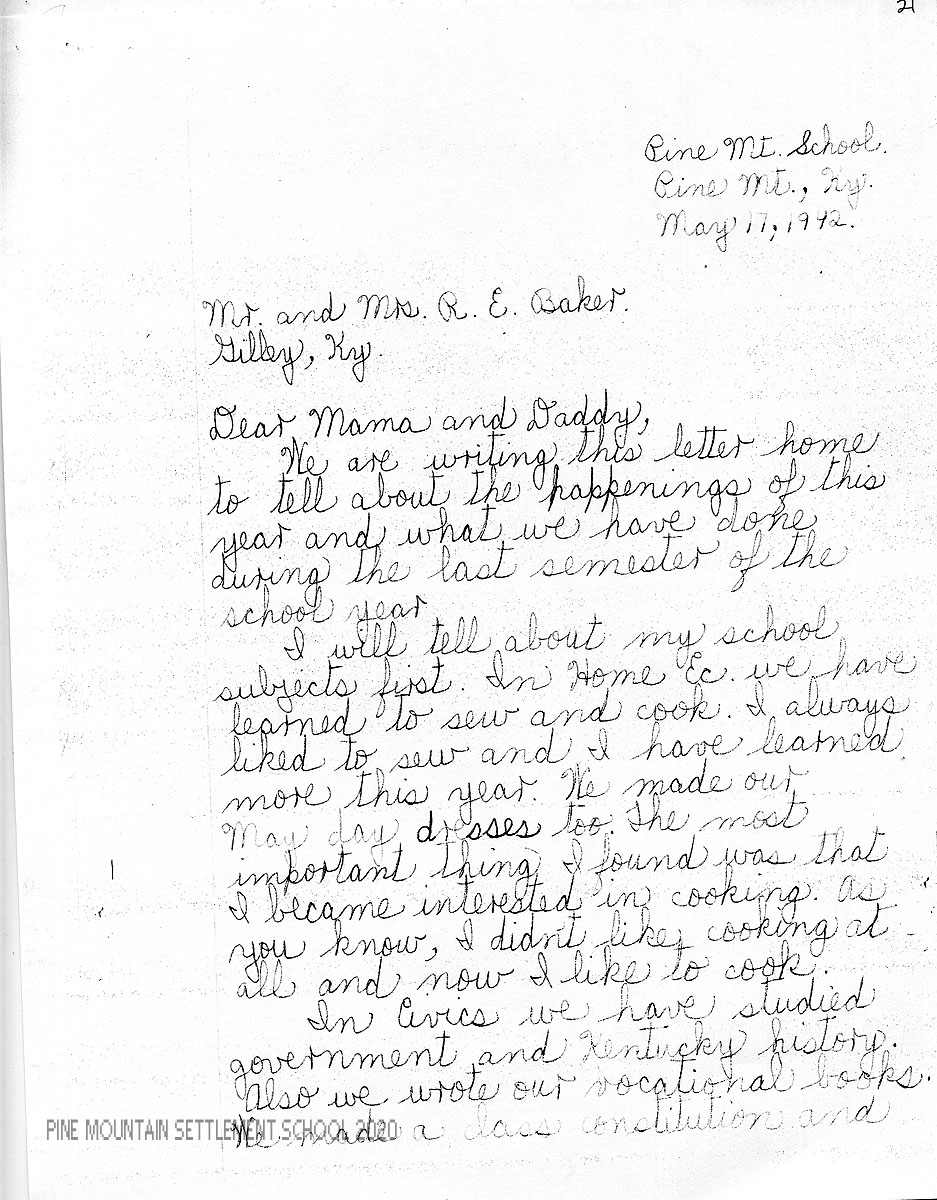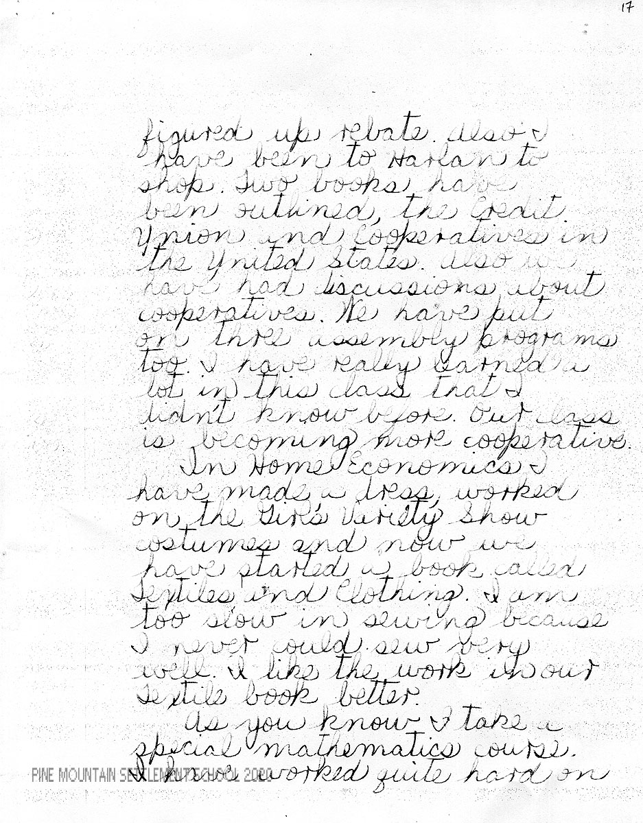 I am enclosing a letter from Mary Sue in which she has tried to evaluate herself both in her studies and in other phases of her life at Pine Mountain. We feel very strongly the importance of self-analysis and criticism, for the best personal development comes as a result of this.