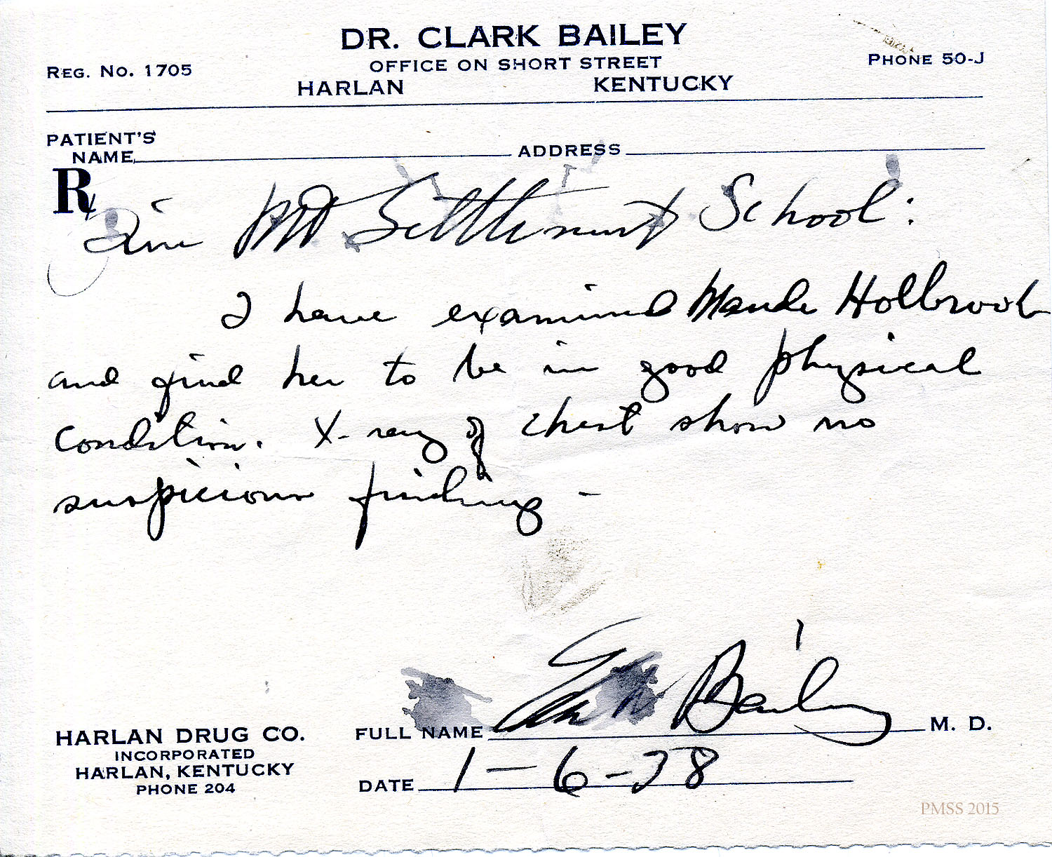 Prescription form signed by Dr. Clark Bailey in Harlan, KY, for Holbrook, affirming her good physical condition.