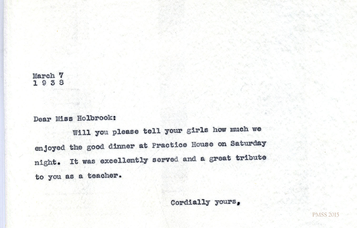 [unsigned] Memo to Holbrook praising the good dinner at Practice House, a tribute to her as a teacher.