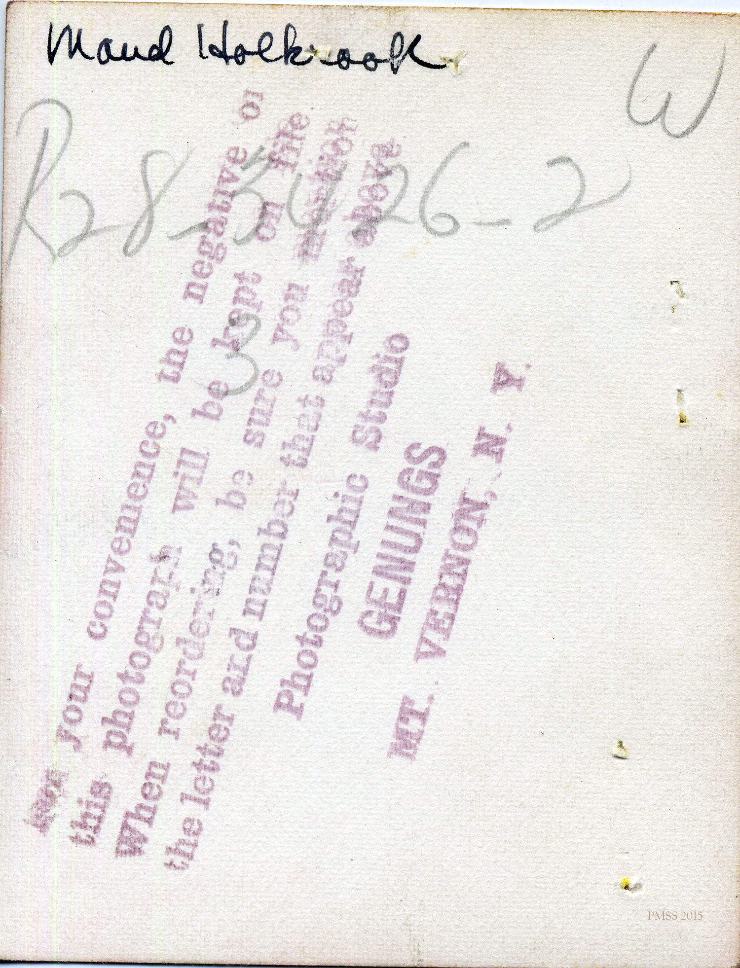 Reverse side of photograph: “Maude Holbrook”; from Genungs Photographic Studios, Mt. Vernon, NY.