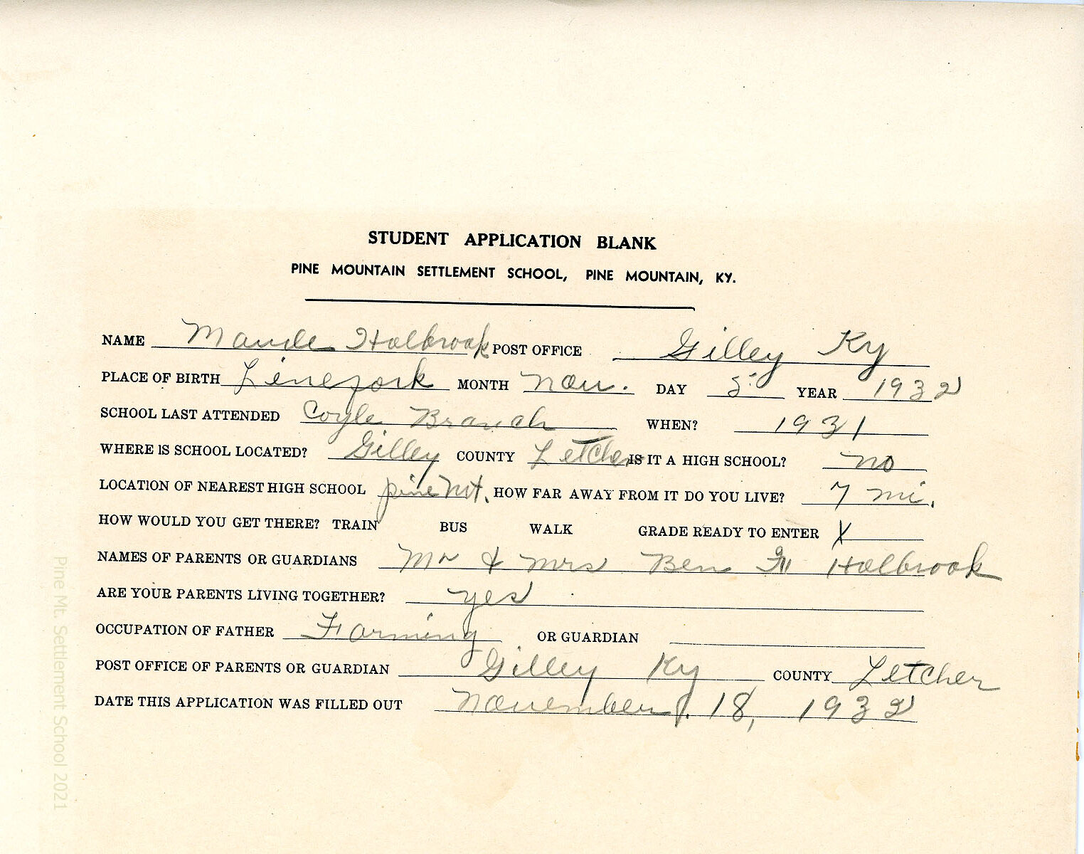 [NOTE: Images of the full set of student records are considered private material and are not generally publicly displayed. Their access may be provided on request, pending approval of Pine Mountain Settlement School and the archivist of the PMSS Collections. Contact the main PMSS Office for information.]