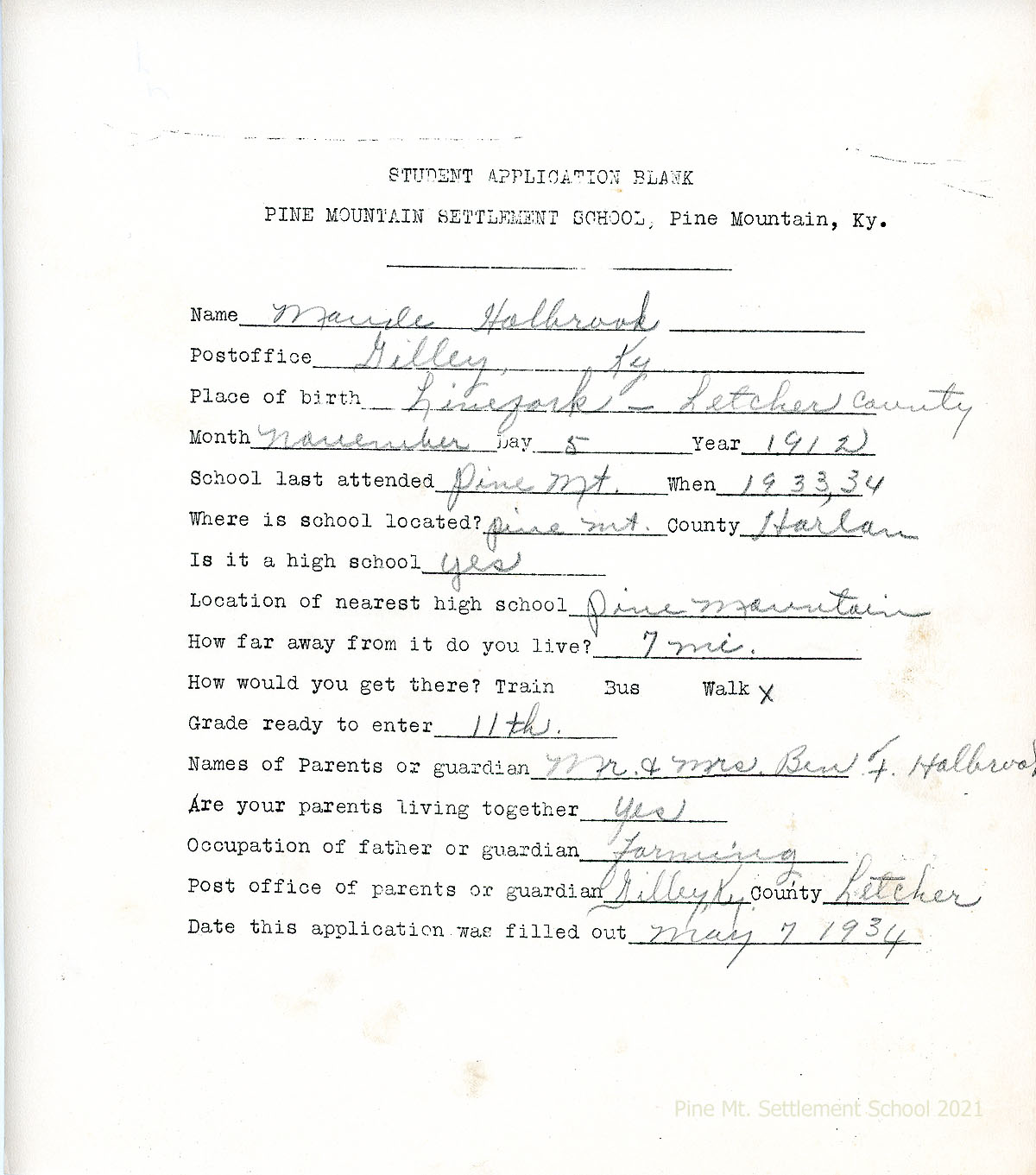 [004] May 7, 1934. STUDENT APPLICATION BLANK for Maude Holbrook, Gilley, Ky,