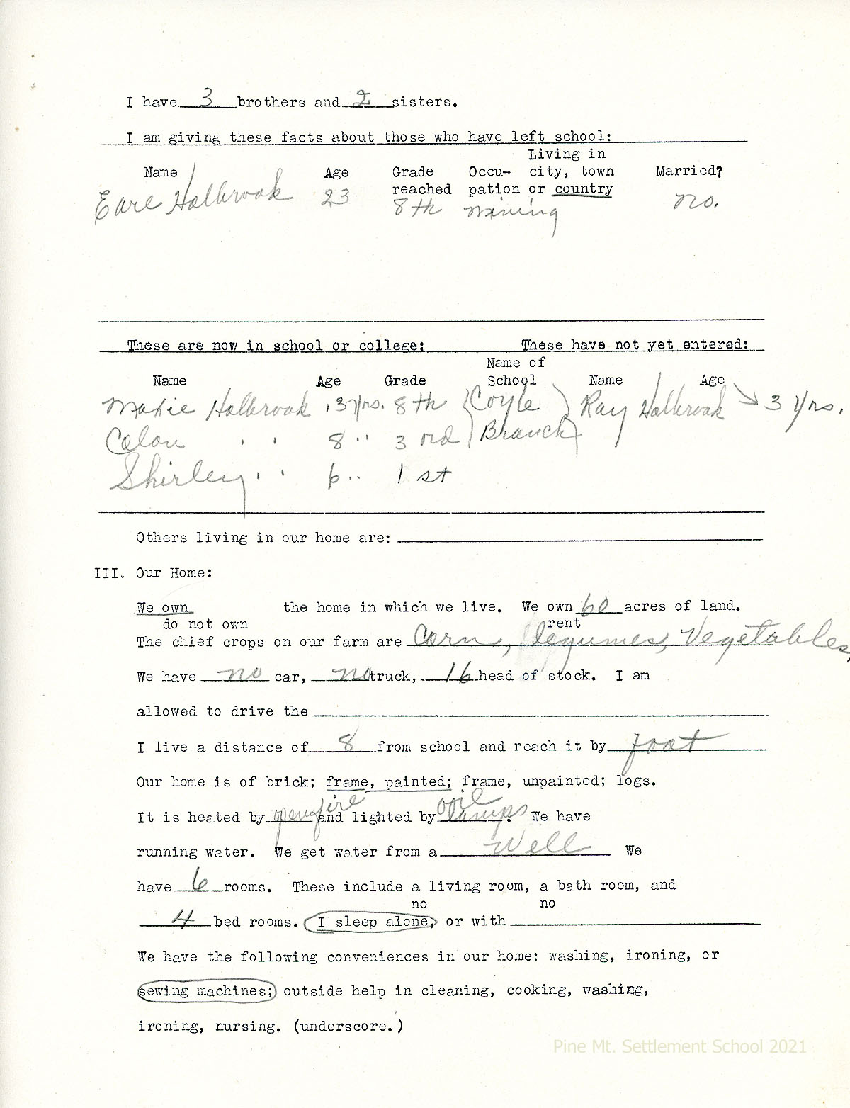 [005b] I. Facts about Myself: Born: 1913, 7 November, at Linefork… II. My Family: Father is Ben F. Holbrook, 46 years old, born in Letcher County, …completed 8 grades…. Mother’s maiden name is Cornett, 43 years old, born in Letcher Co., completed 8 grades….