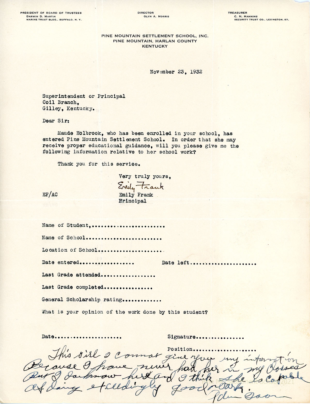[006] November 23, 1932. To Superintendent or Principal, Coil (sic) Branch, Gilley, Kentucky from Emily Frank, Principal, on Pine Mountain Settlement School letterhead. Requests “information relative to her school work.” The response was in the form of a handwritten note at the bottom of the page; “This girl I cannot give you my information because I have never had her in my classes, but I do know her and I think she is capable of doing exceedingly good work. [illegible signature].”