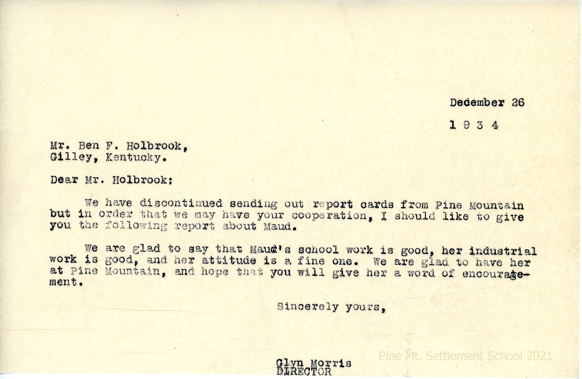 [008] December 26, 1934. To Mr. Ben F. Holbrook, Gilley, KY, from Glyn Morris, Director, explaining that the school has replaced report cards with letters. “…Maud’s (sic) school work is good, her industrial work is good and her attitude is a fine one. We are glad to have her at Pine Mountain and hope that you will give her a word of encouragement.”