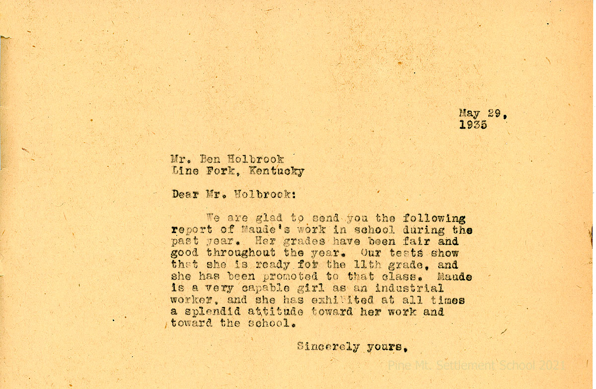 [009] May 29, 1935.To Mr. Ben Holbrook, Line Fork, KY, from [unsigned], reporting on Maude’s work at school during the past year. “Her grades have been fair and good throughout the year….she is ready for the 11th grade…. Maude is a very capable girl as an industrial worker and she has exhibited at all times a splendid attitude toward her work and toward the school.”