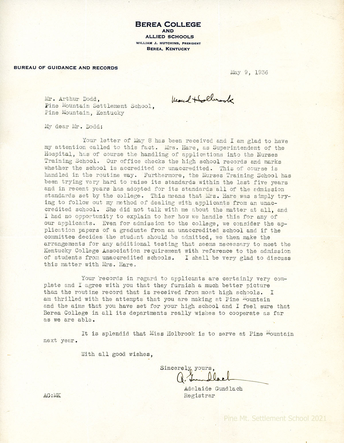 [011] May 9, 1936. To Arthur Dodd, from Adelaide Gundlach, Registrar, Berea (KY) College. Refers to Dodd’s May 8th letter; explains how applicants from unaccredited schools are handled by the Registrar’s office and the Nurses Training School. Praises PMSS’s complete school records and “the aims that you have set for your high school. … It is splendid that Miss Holbrook is to serve at Pine Mountain next year.”