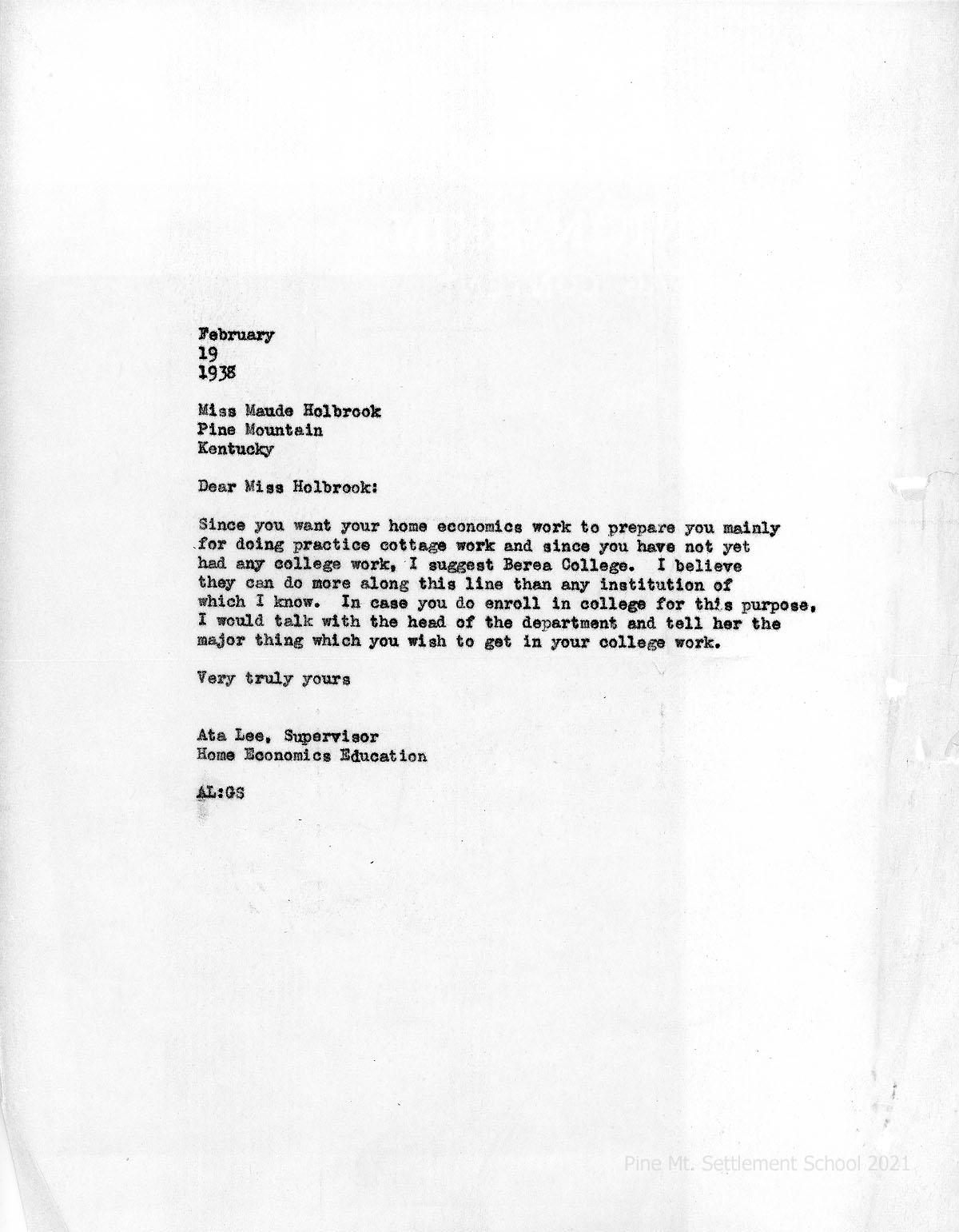 [013] February 19, 1938. To Miss Holbrook at Pine Mountain, KY, from Ata Lee, Supervisor, Home Economics Education. Suggests that she apply to Berea College, “[s]ince you want your home economics work to prepare you mainly for doing practice cottage work and since you have not yet had any college work….”
