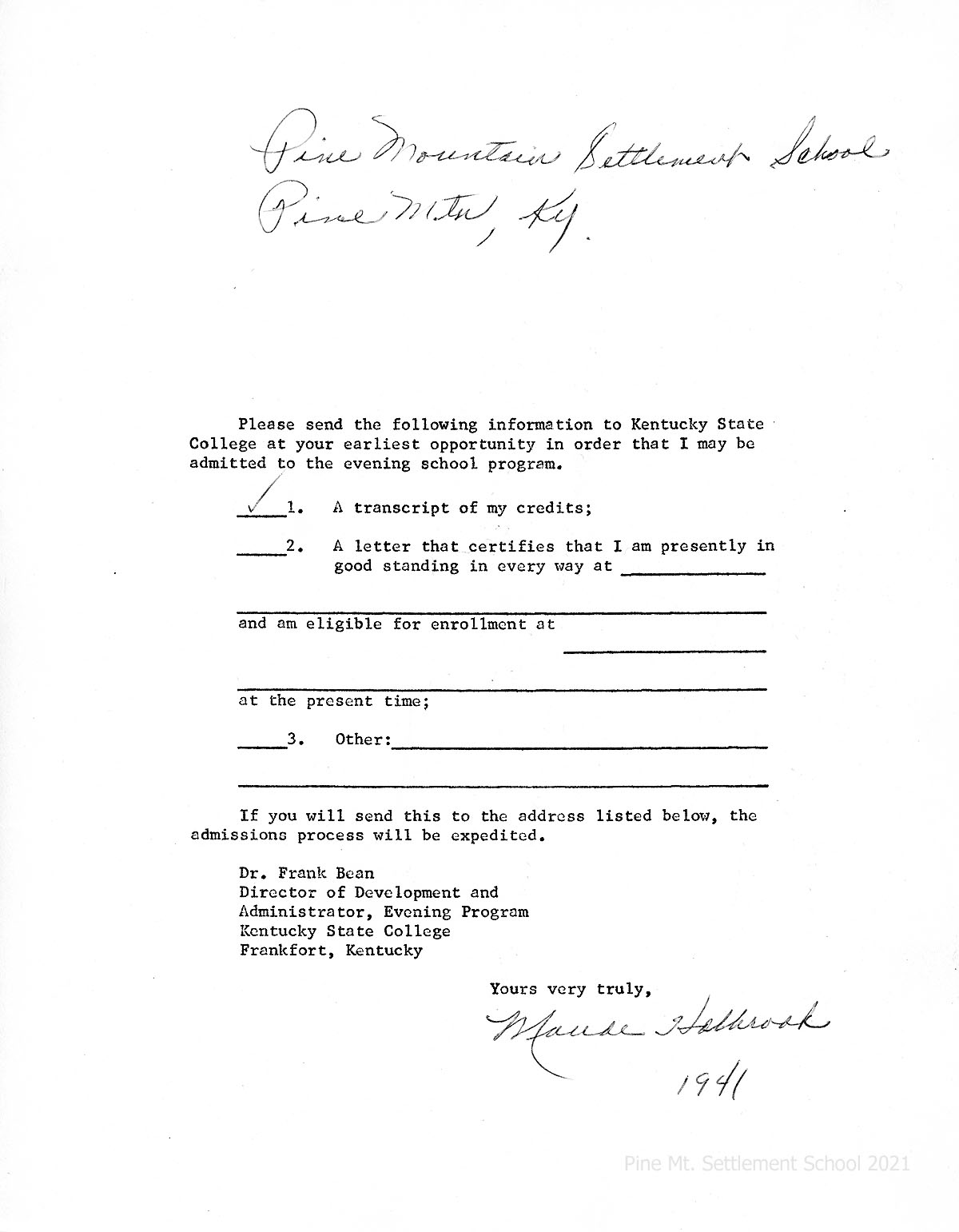 [014] [No day/month], 1941.To PMSS from Maude Holbrook. A form requesting that a transcript of her credits be sent to Kentucky State College, Frankfort, KY, “in order that I may be admitted to the evening school program.”