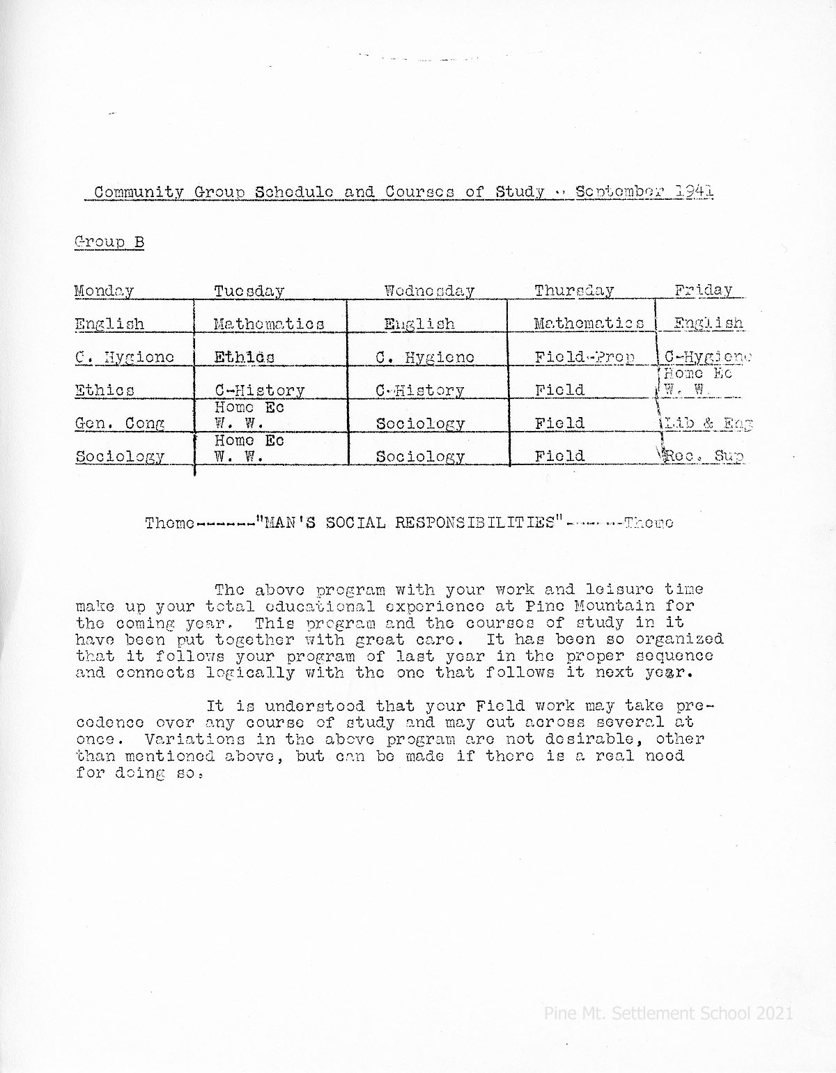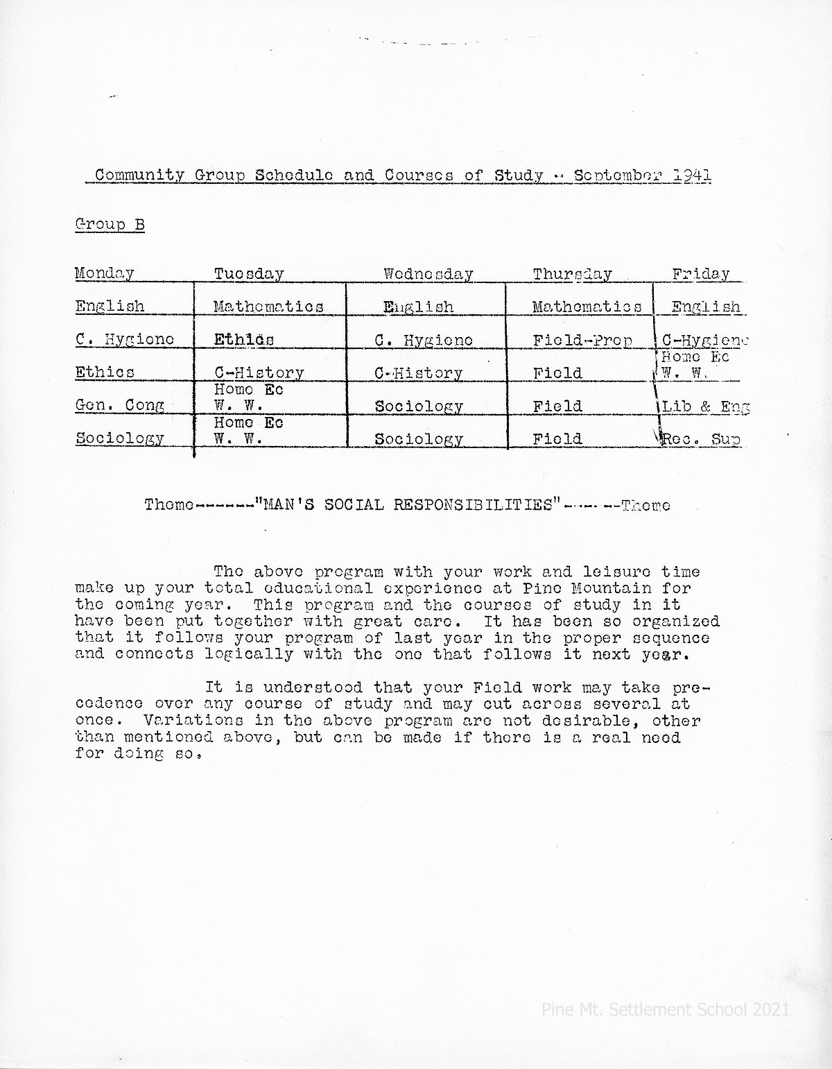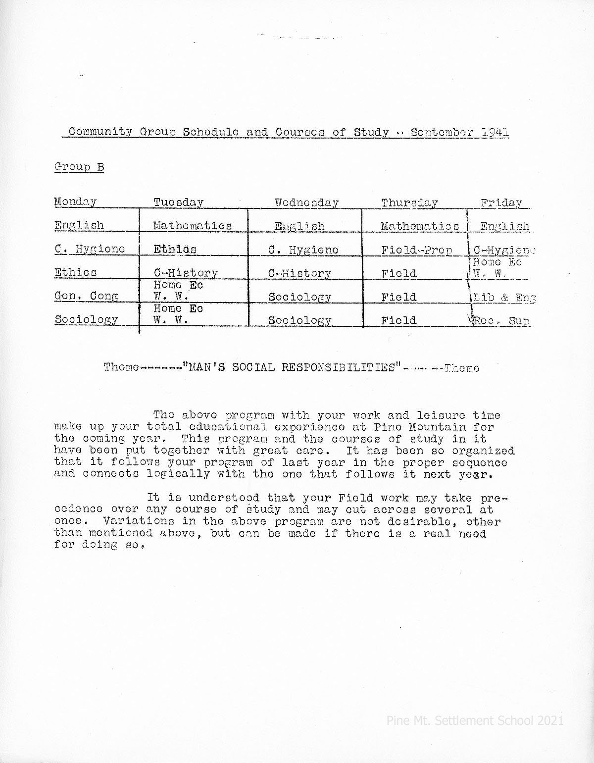 [015] September 1941. Community Group Schedule and Courses of Study. Group B. A table showing studies for Monday through Friday. Theme: “Man’s Social Responsibilities.” A paragraph describes the program as consisting of “your total educational experience at Pine Mountain for the coming year.” Explains how the program is organized.