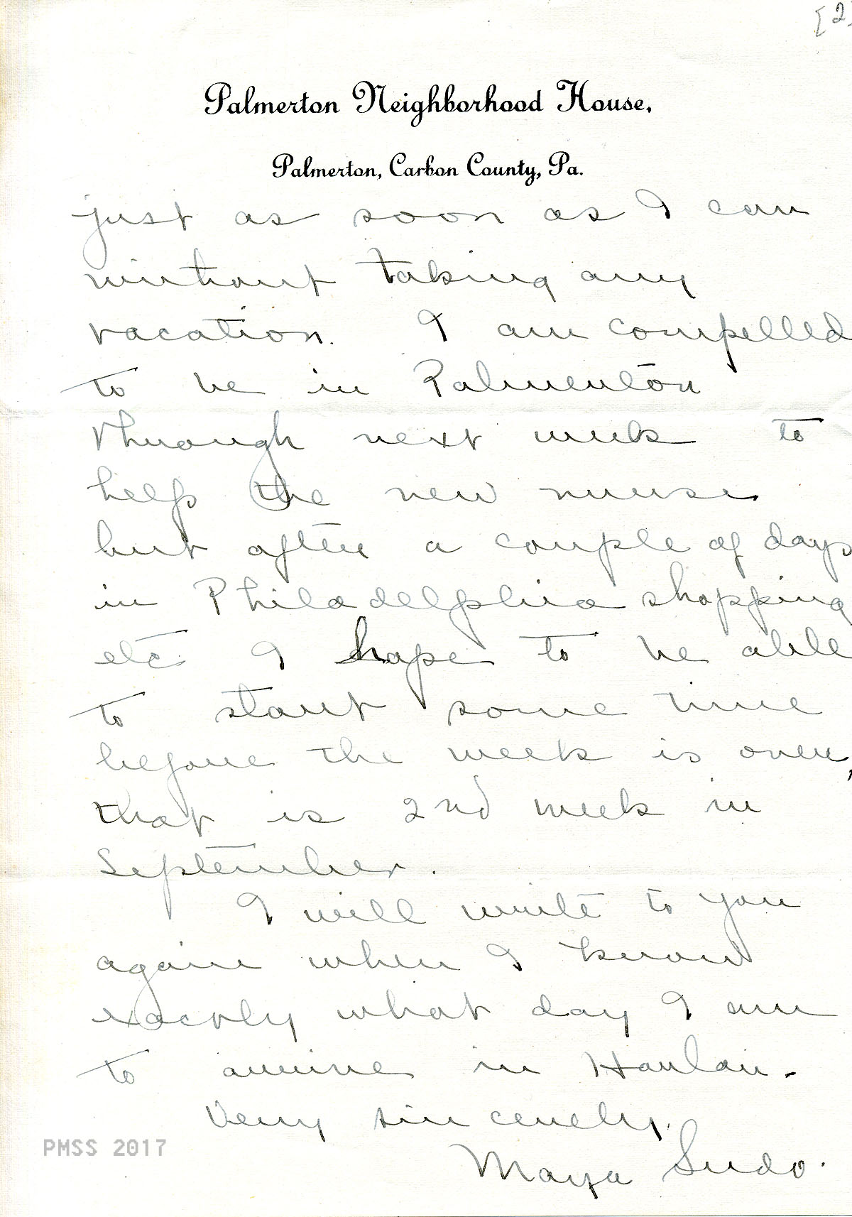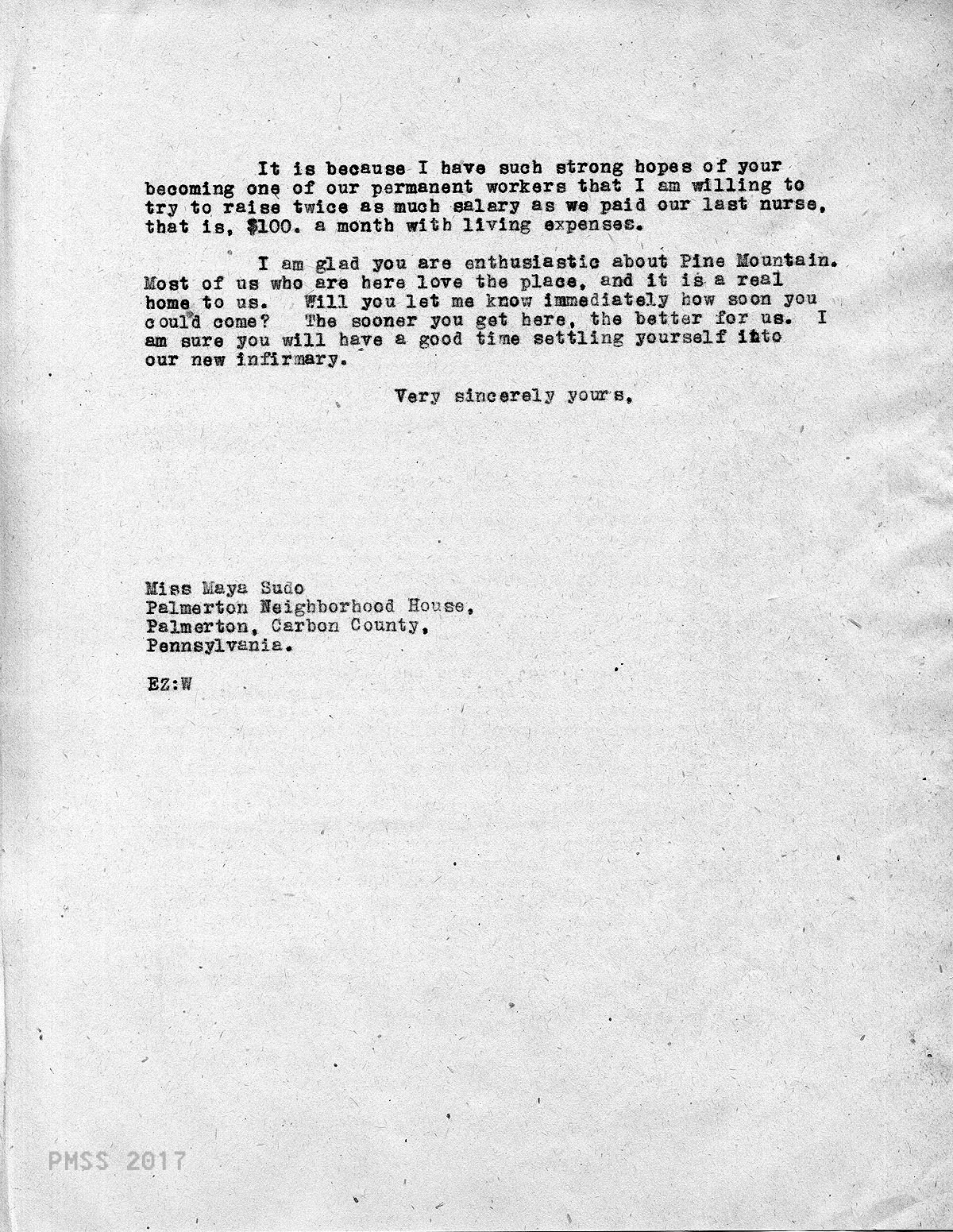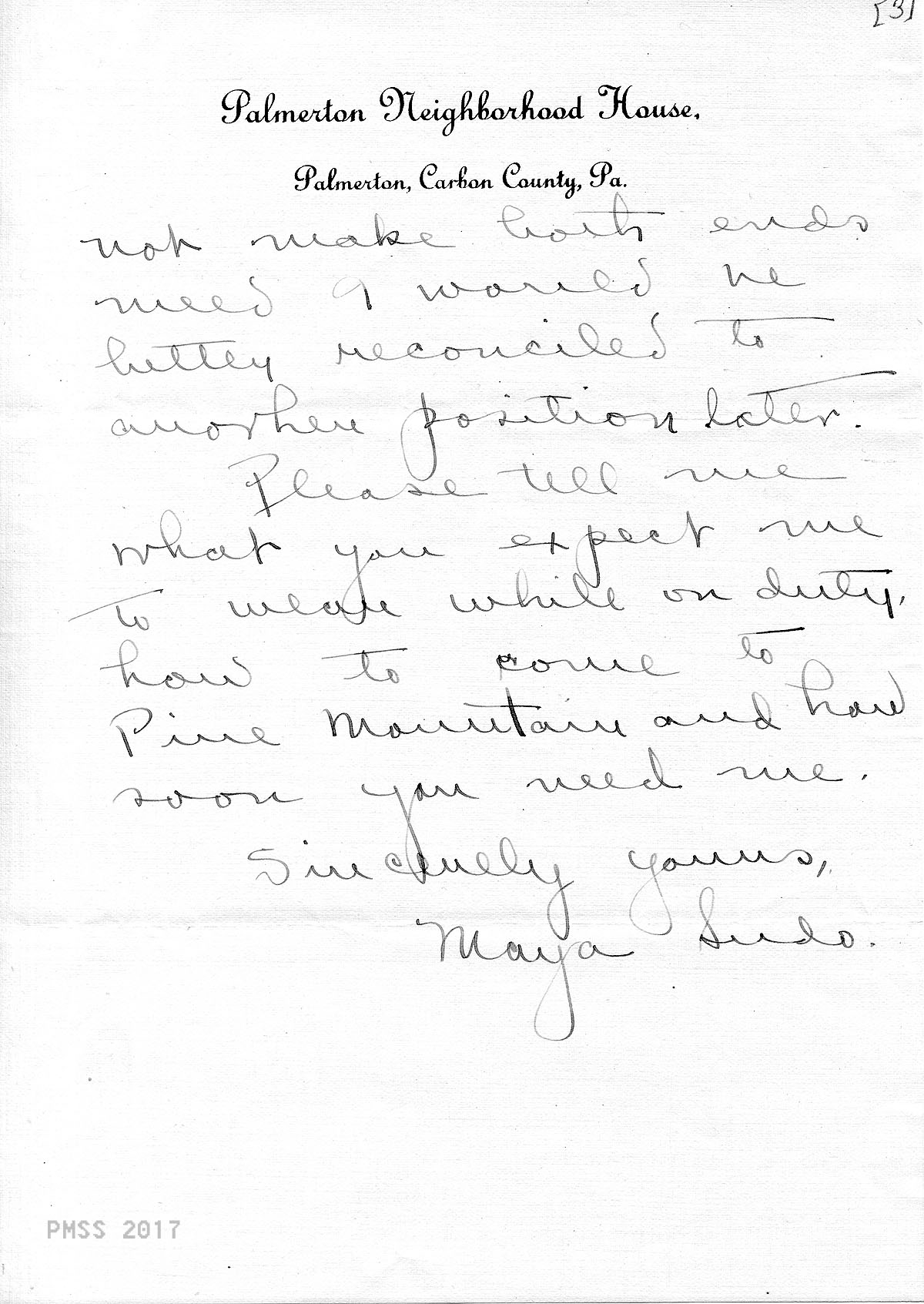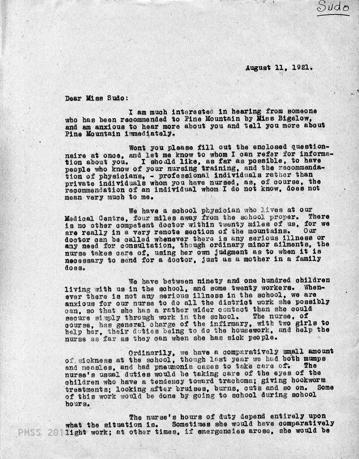 TAGS: Maya Sudo correspondence, nurses, teachers, industrial work trainers, Infirmary, Line Fork Medical Settlement, Medical Settlement Big Laurel