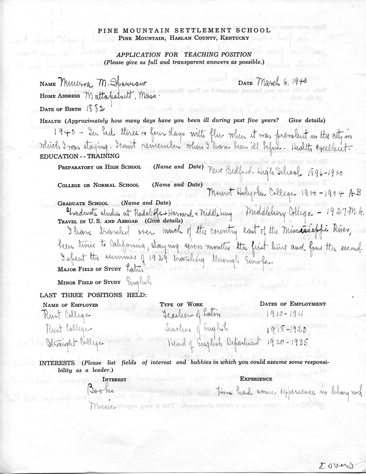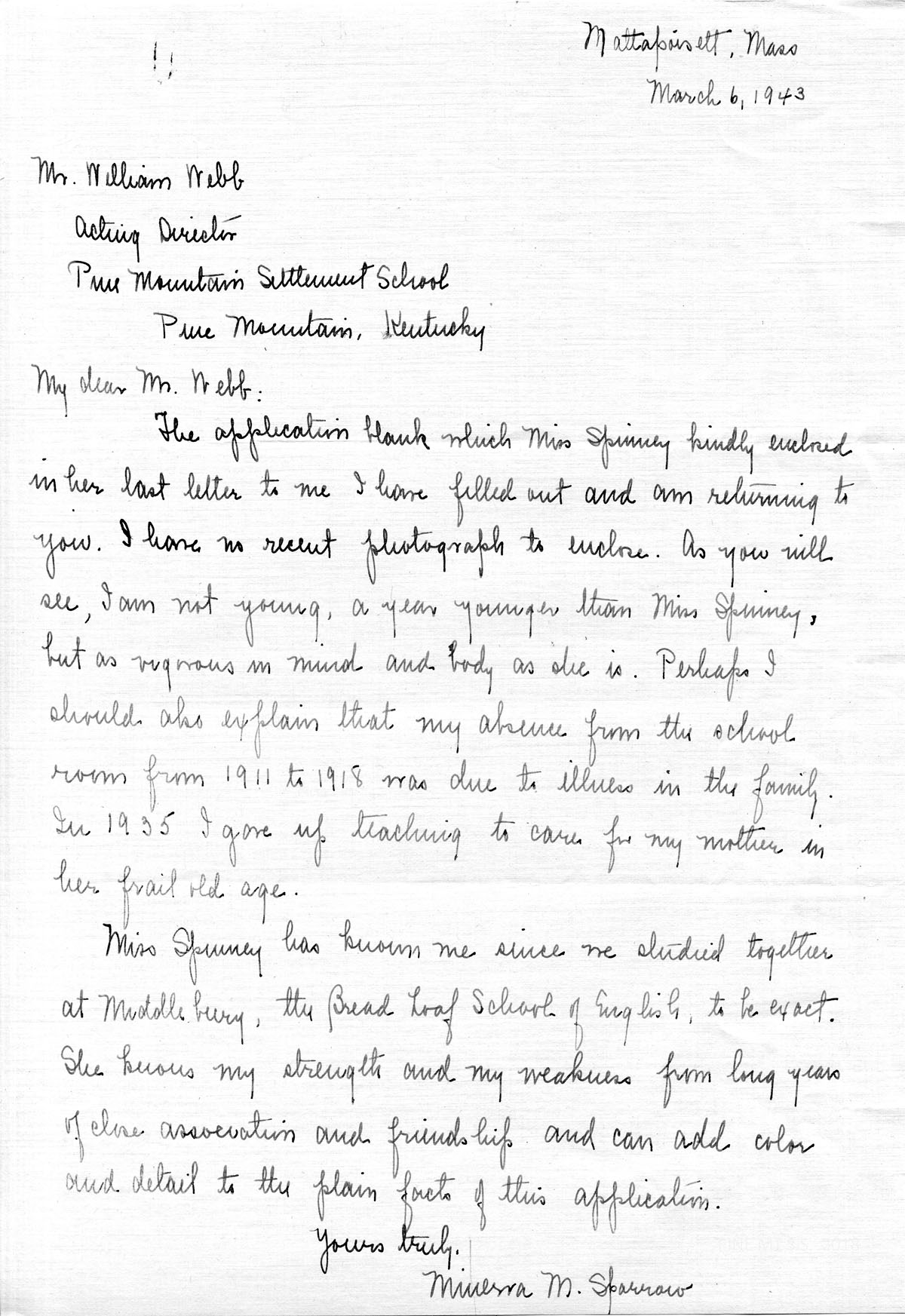 The application blank which Miss Spinney kindly enclosed in her last letter to me I have filled out and am returning to you. I have no recent photograph to enclose. As you will see, I am not young, a year younger than Miss Spinney, but as vigorous in mind and body as she is. Perhaps I should also explain that my absence from the school room from 1911 to 1918 was due to illness in the family. In 1935 I gave up teaching to care for my mother in her frail old age.