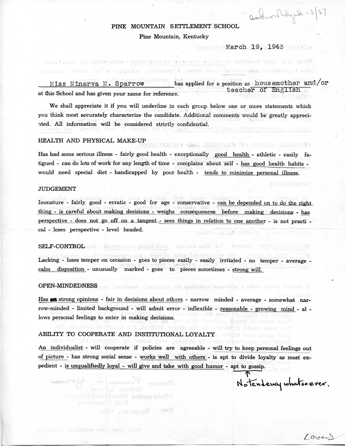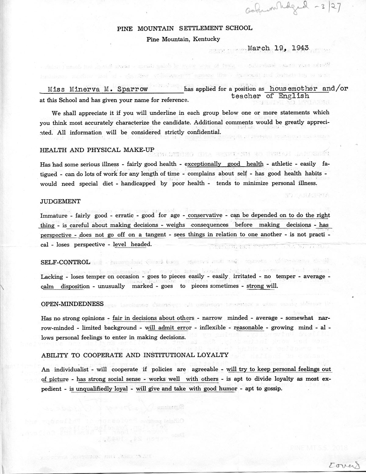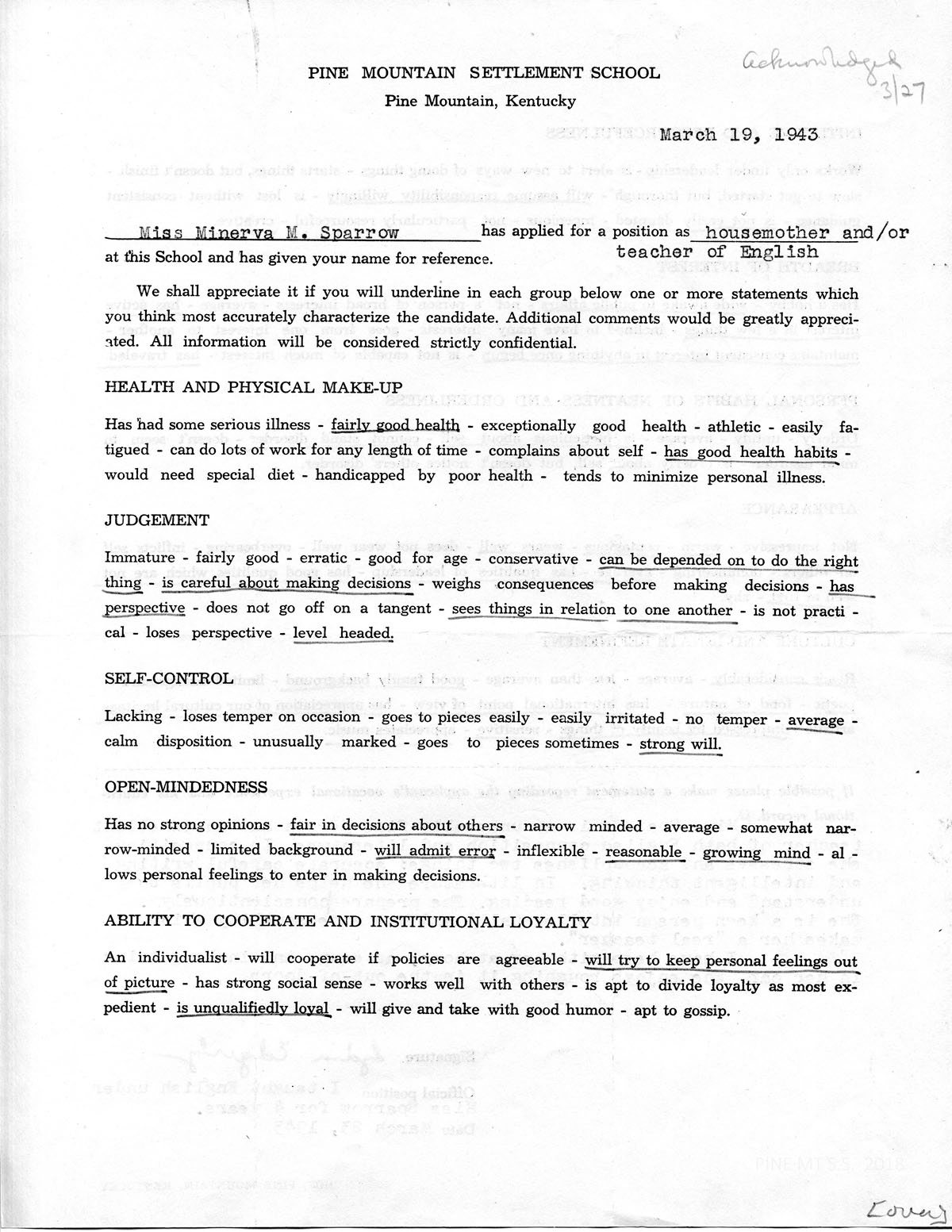 [Header: PINE MOUNTAIN SETTLEMENT SCHOOL, PINE MOUNTAIN, HARLAN COUNTY, KENTUCKY; APPLICATION FOR TEACHING POSITION….]