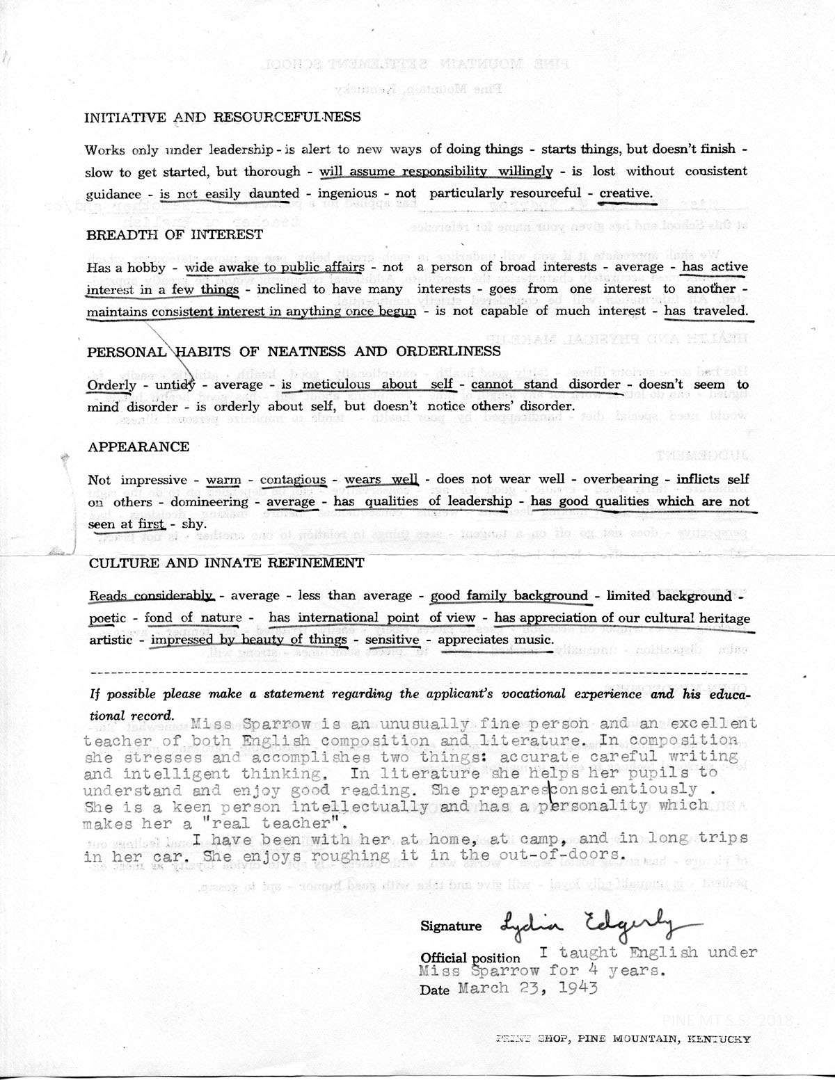 [Typewritten entry] Miss Sparrow is an unusually fine person and an excellent teacher of both English composition and literature. In composition she stresses and accomplishes two things: accurate careful writing and intelligent thinking. In literature she helps her pupils to understand and enjoy good reading. She prepares conscientiously. She is a keen person intellectually and has a personality which makes her a “real teacher.”
