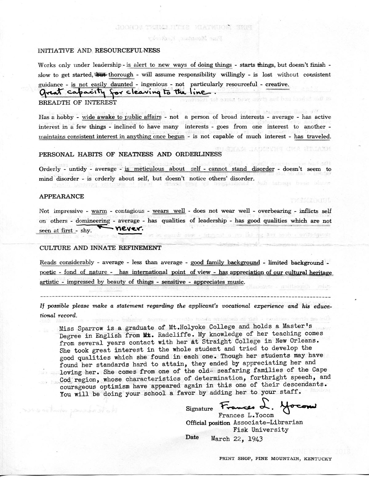 Miss Sparrow is a graduate of Mt. Holyoke College and holds a Master’s Degree in English from Radcliffe. My knowledge of her teaching comes from several years contact with her at Straight College in New Orleans. She took great interest in the whole student and tried to develop the good qualities which she found in each one. Though her students may have found her standards hard to attain, they ended by appreciating her and loving her. She comes from one of the old seafaring families of the Cape Cod region, whose characteristics of determination, forthright speech, and courageous optimism have appeared again in this one of their descendants. You will be doing your school a favor by adding her to your staff.