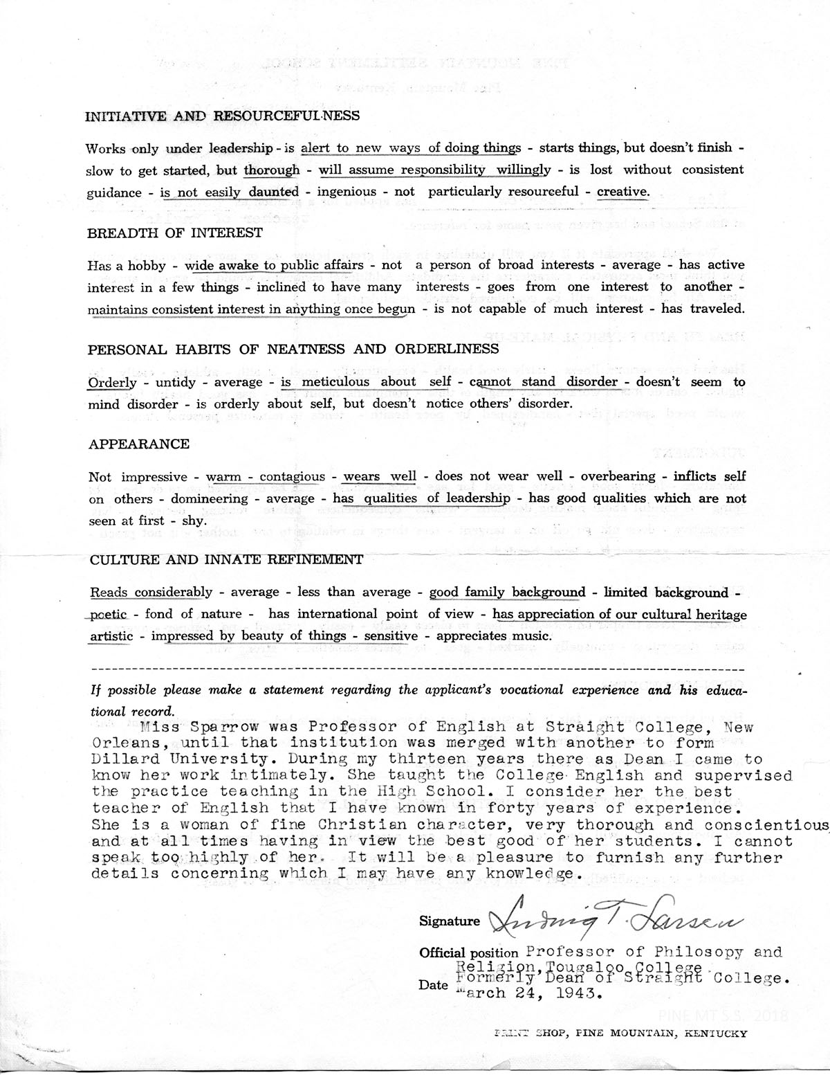 Miss Sparrow was Professor of English at Straight College, New Orleans, until that institution was merged with another to form Dillard University. During my thirteen years there as Dean, I came to know her work intimately. She taught the College English and supervised the practice teaching in the High School. I consider her the best teacher of English that I have known in forty years of experience. She is a woman of fine Christian character, very thorough and conscientious and at all times having in view the best good of her students. In cannot speak too highly of her.