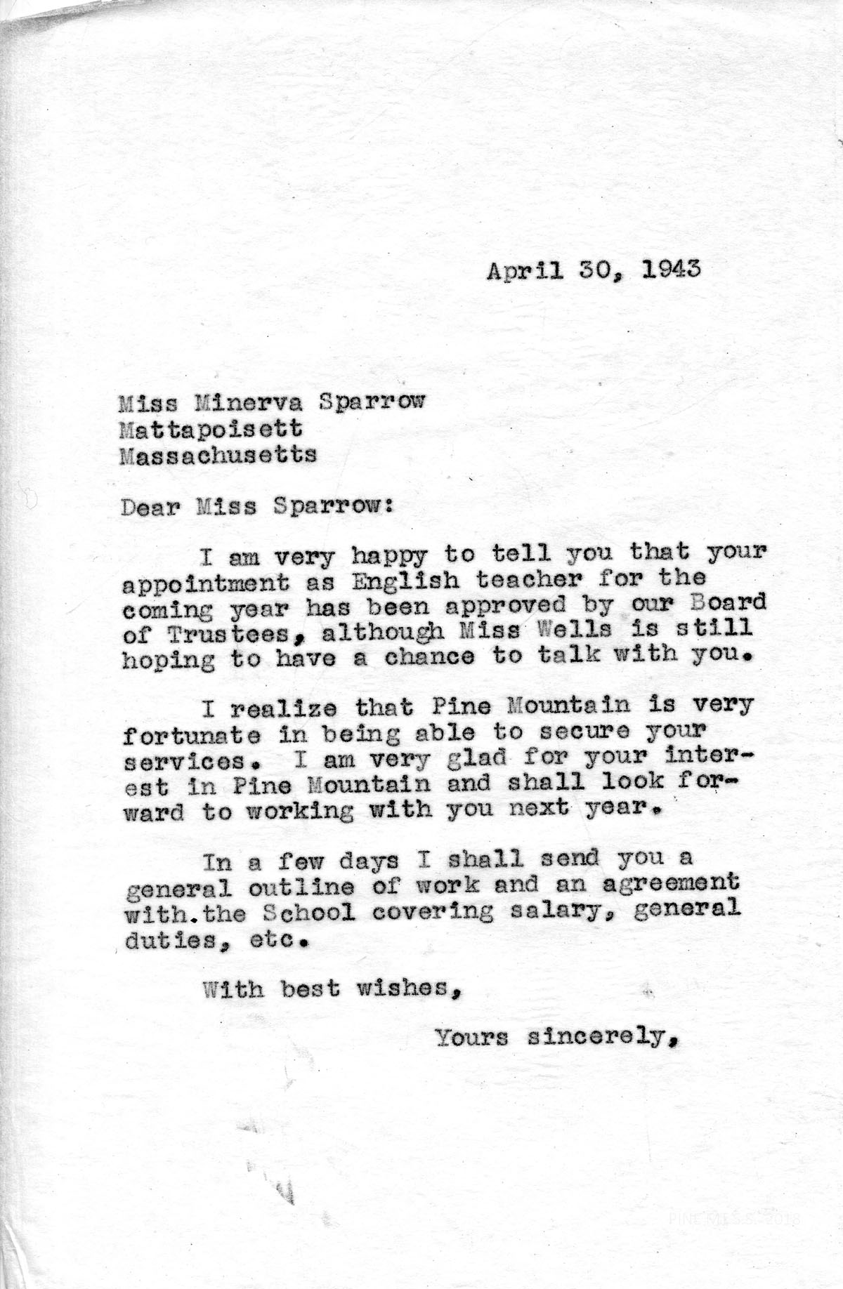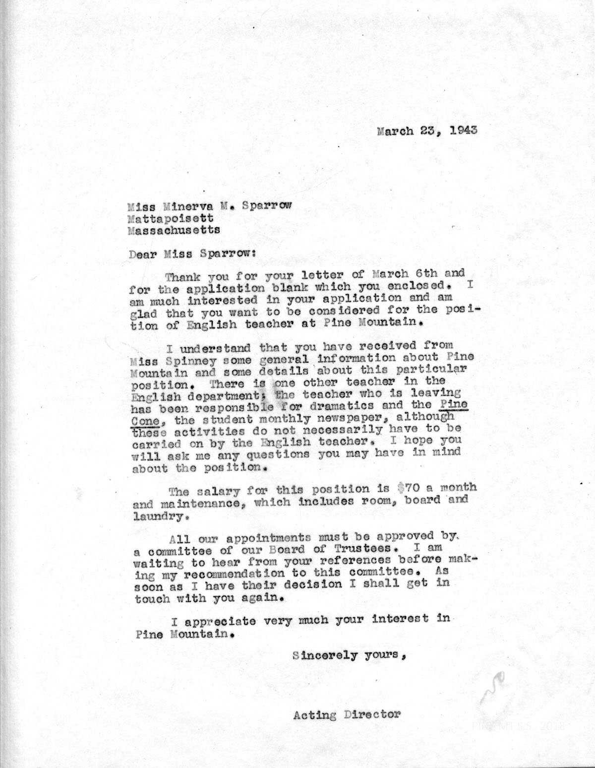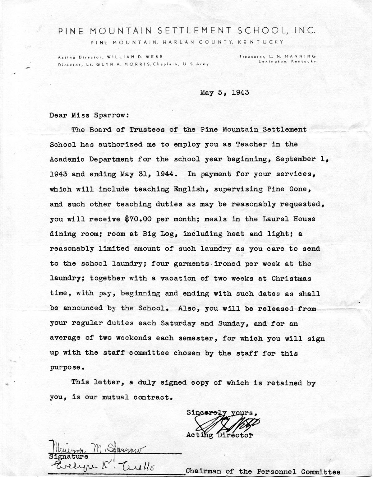The Board of Trustees of the Pine Mountain Settlement School has authorized me to employ you as Teacher in the Academic Department for the school year beginning, September 1, 1943, and ending May 31, 1944. In payment for your services, which will include teaching English, supervising Pine Cone, and such other teaching duties as may be reasonably requested, you will receive $70.00 per month; meals in the Laurel House dining room; room at Big Log, including heat and light; a reasonably limited amount of such laundry as you care to send to the school laundry; four garments ironed per week at the laundry; together with a vacation of two weeks at Christmas time, with pay, beginning and ending with such dates as shall be announced by the School. Also, you will be released from your regular duties each Saturday and Sunday, and for an average of two weekends each semester, for which you will sign up with the staff committee chosen by the staff for this purpose.