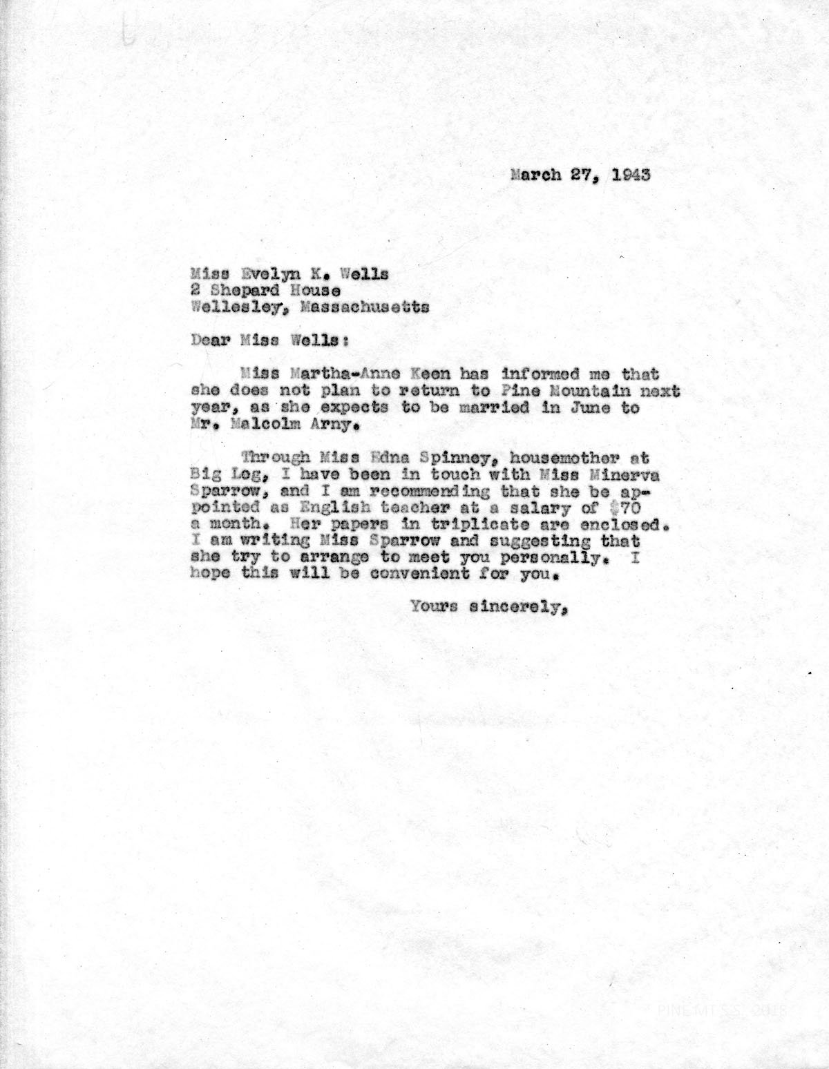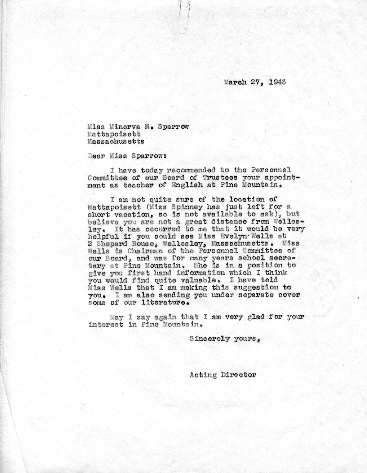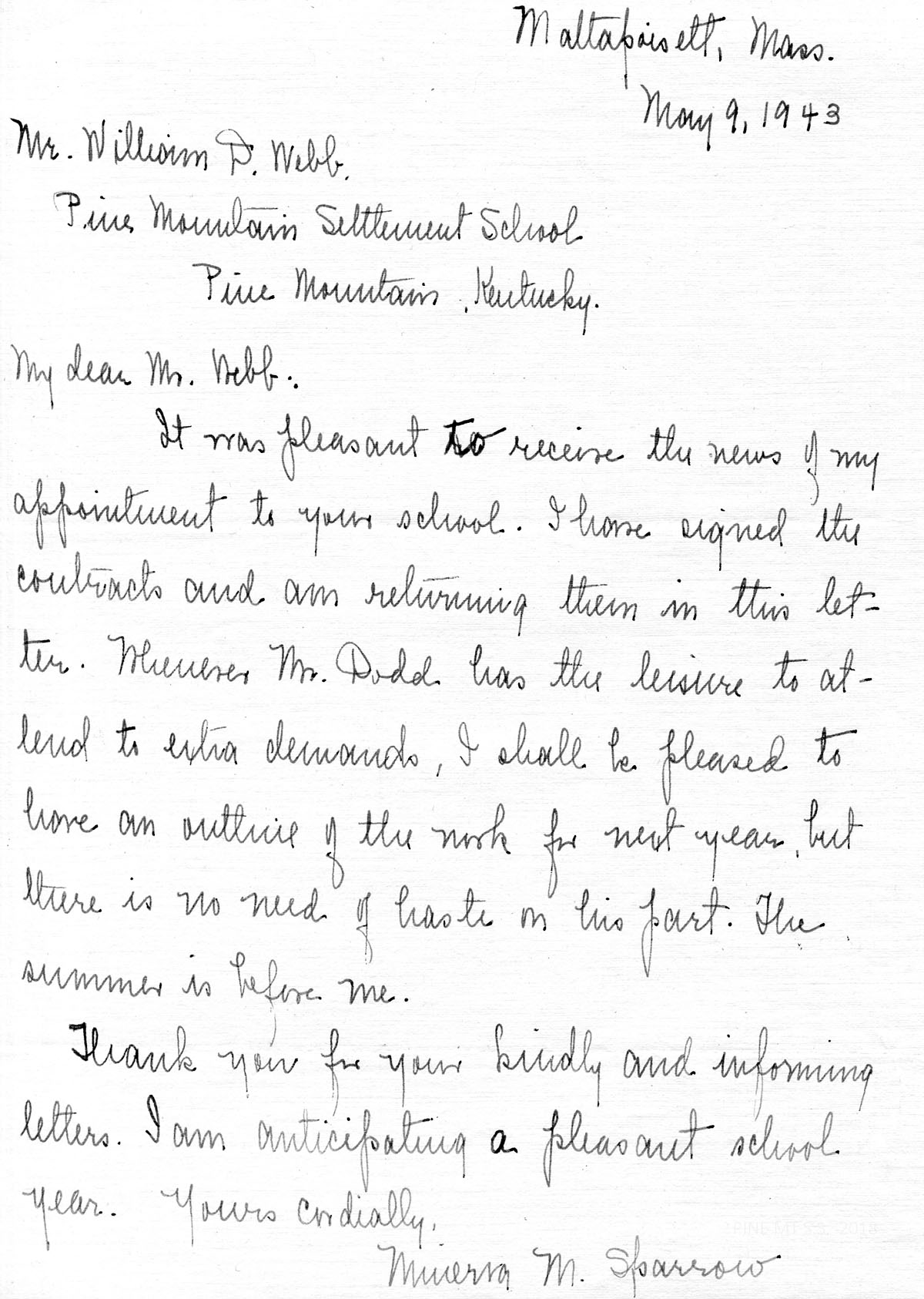 The Board of Trustees of the Pine Mountain Settlement School has authorized me to employ you as Teacher in the Academic Department for the school year beginning, September 1, 1943, and ending May 31, 1944. In payment for your services, which will include teaching English, supervising Pine Cone, and such other teaching duties as may be reasonably requested, you will receive $70.00 per month; meals in the Laurel House dining room; room at Big Log, including heat and light; a reasonably limited amount of such laundry as you care to send to the school laundry; four garments ironed per week at the laundry; together with a vacation of two weeks at Christmas time, with pay, beginning and ending with such dates as shall be announced by the School. Also, you will be released from your regular duties each Saturday and Sunday, and for an average of two weekends each semester, for which you will sign up with the staff committee chosen by the staff for this purpose.