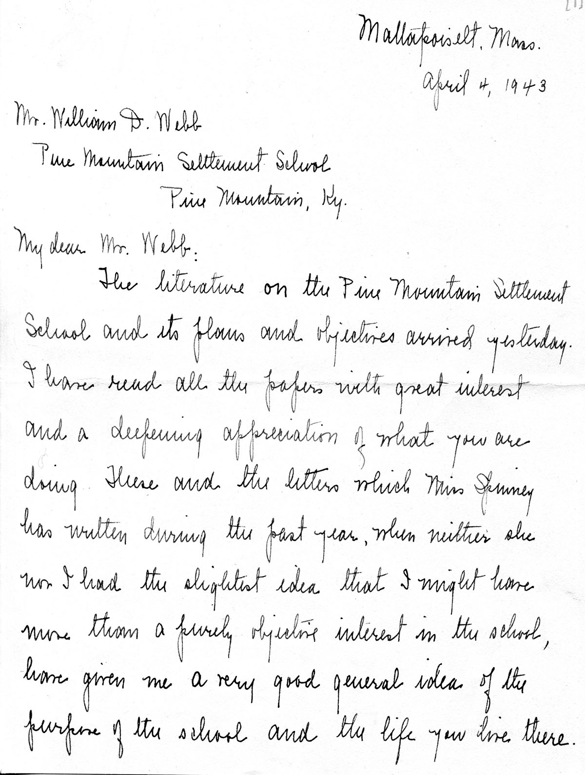 My interest in Pine Mountain is due wholly to the letters which my friend, Miss [Edna O.] Spinney, has written me this year. The work seems most worthwhile and in line with my years of teaching in church schools in the South.