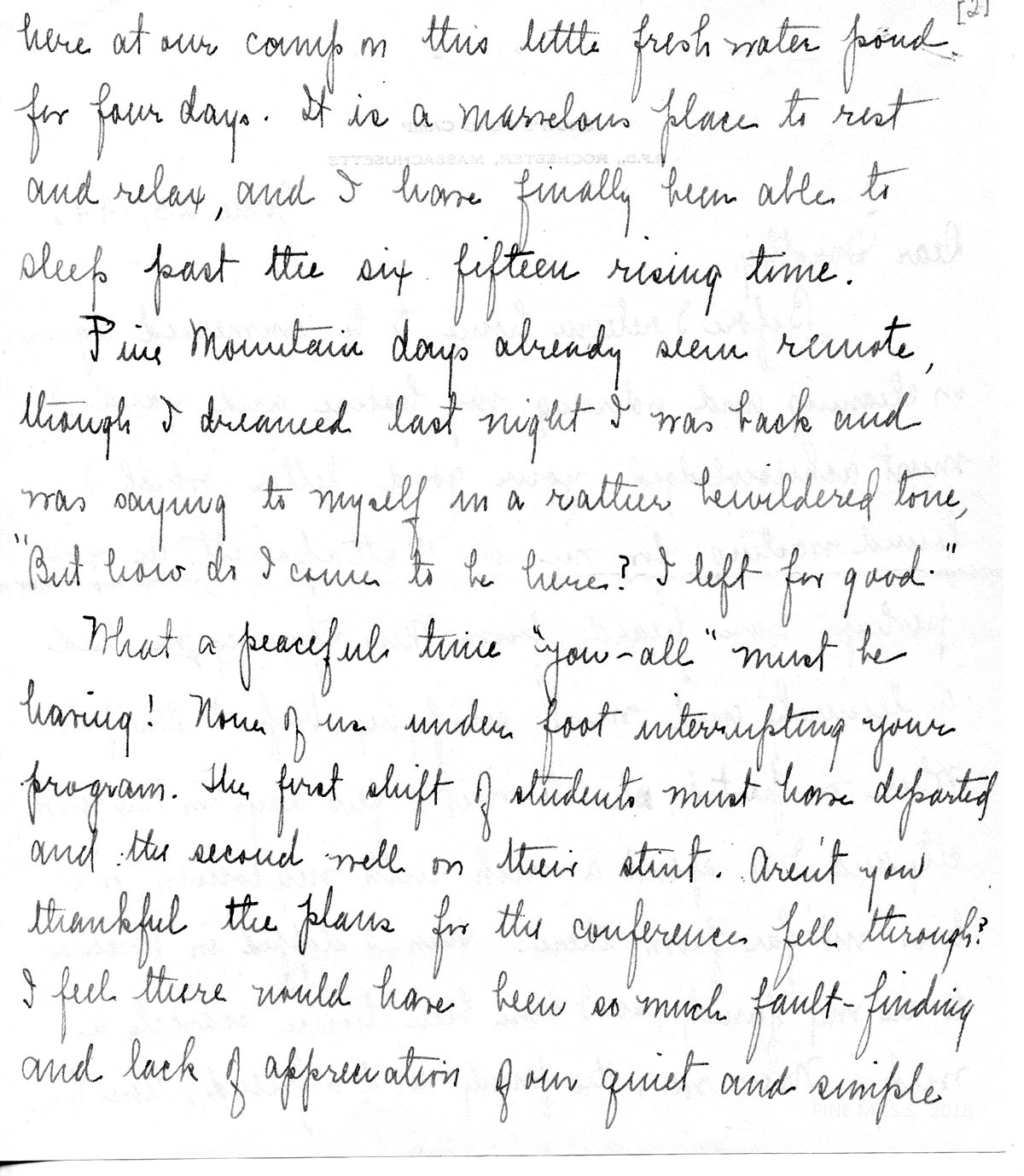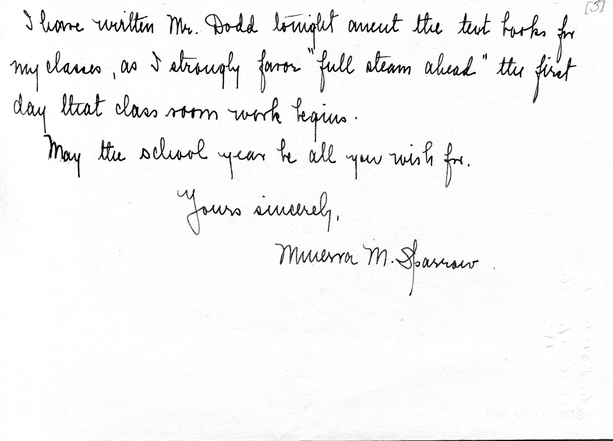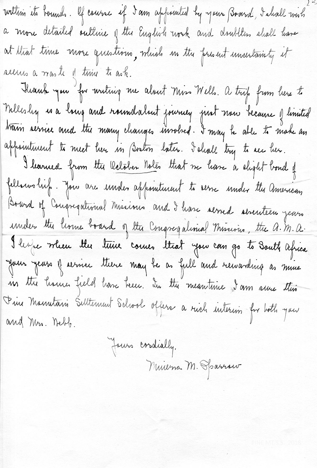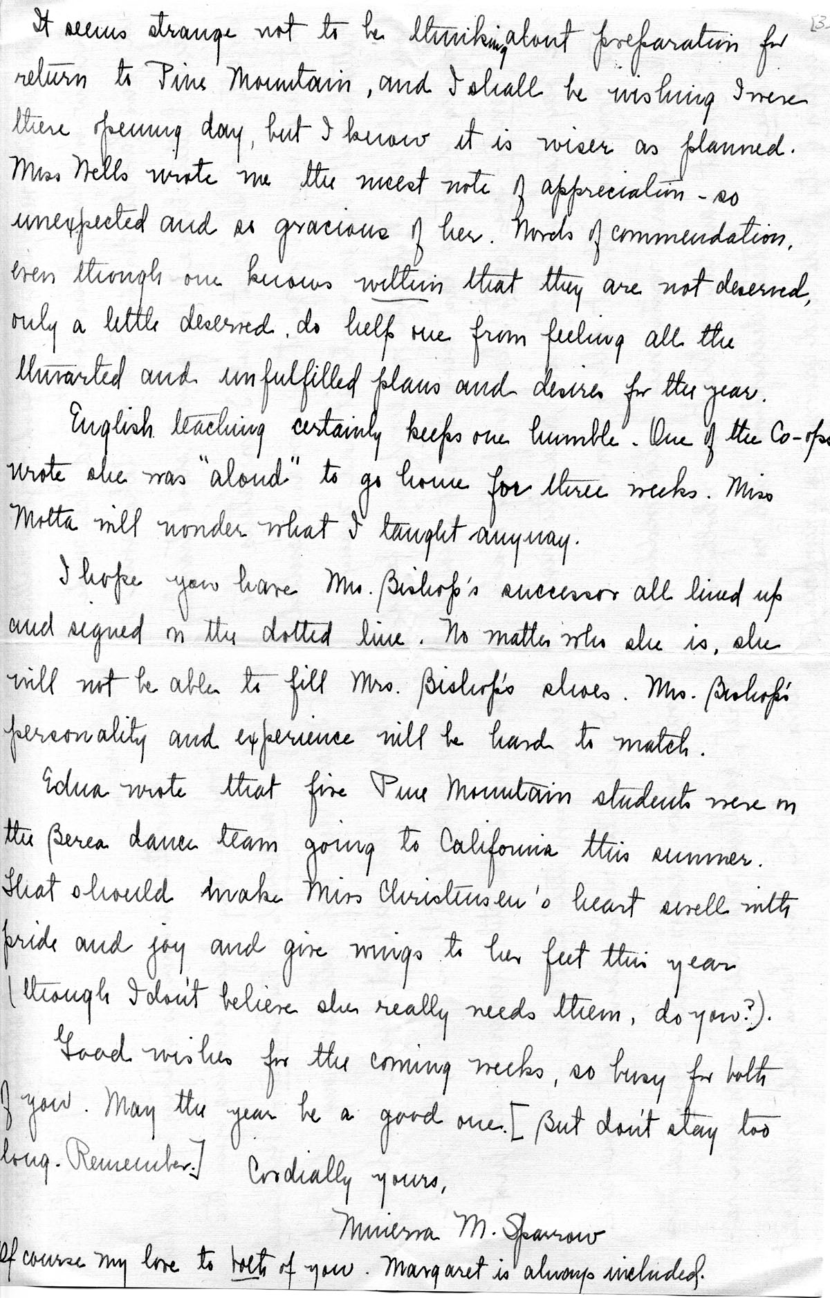 I am looking forward to the coming year with great anticipation. Miss Spinney’s letters have led me to feel that it will be a great experience to share[?] in the life and work of Pine Mountain. Your letter suggests we shall have plenty of good things from the garden to eat, thanks to someone’s hard work this summer.