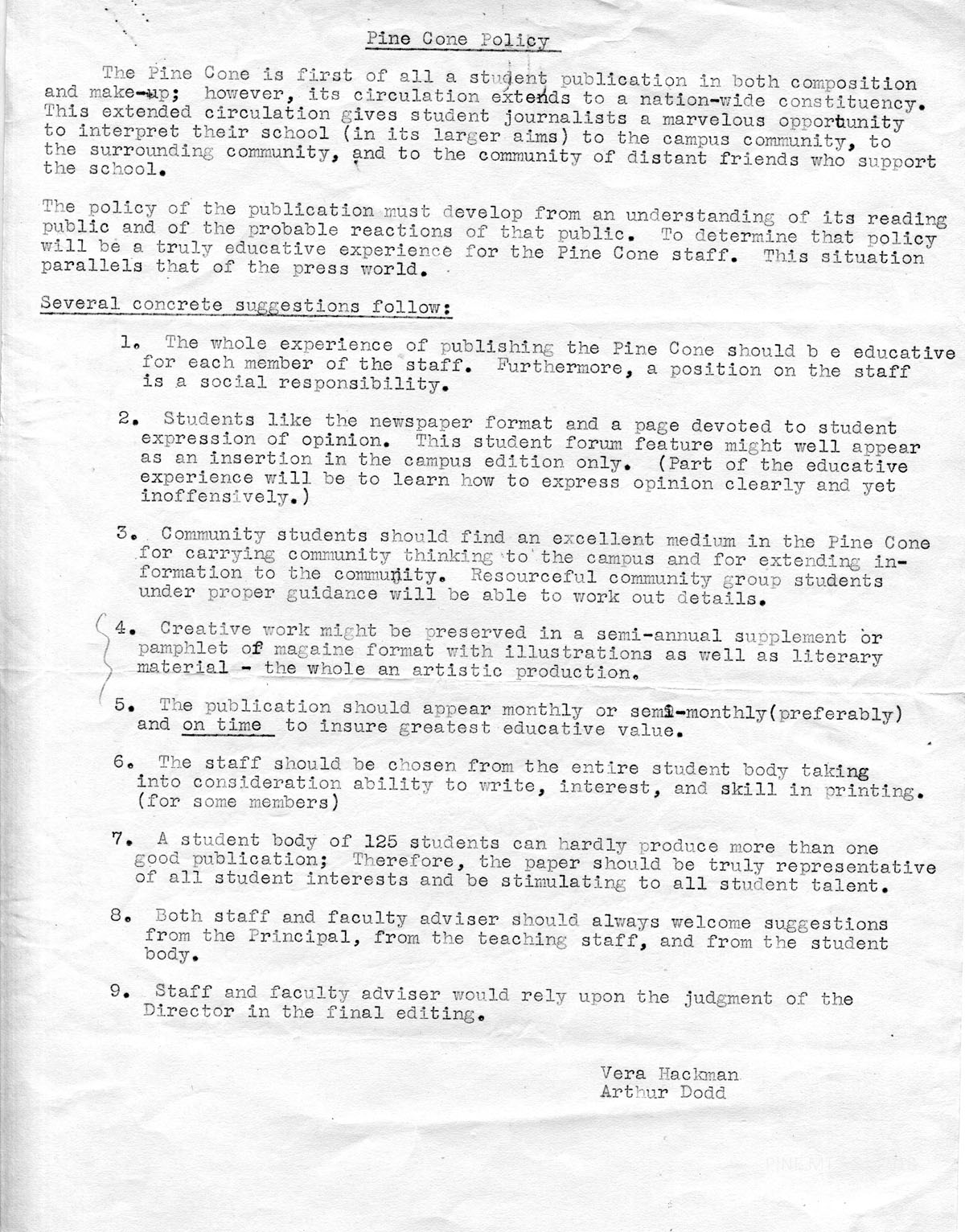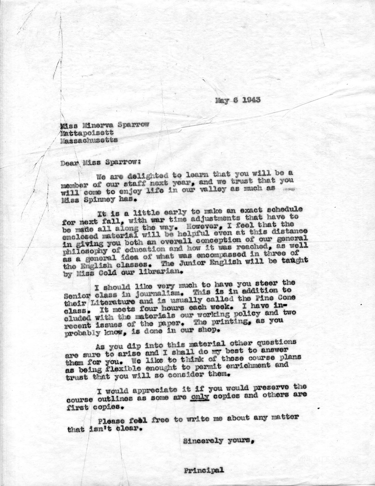 I should like very much to have you steer the Senior class in journalism. This is in addition to their Literature and is usually called the Pine Cone class. It meets four hours each week. I have included with the materials our working policy and two recent issues of the paper. The printing, as you probably know, is done in our shop.