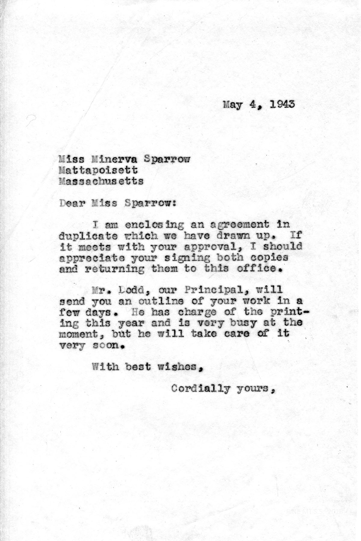 It was pleasant to receive the news of my appointment to your school. I have signed the contracts and am returning them in this letter. Whenever Mr. Dodd has the leisure to attend to extra demands, I shall be pleased to have an outline of the work for next year, but there is no need of haste on his part. The summer is before me.